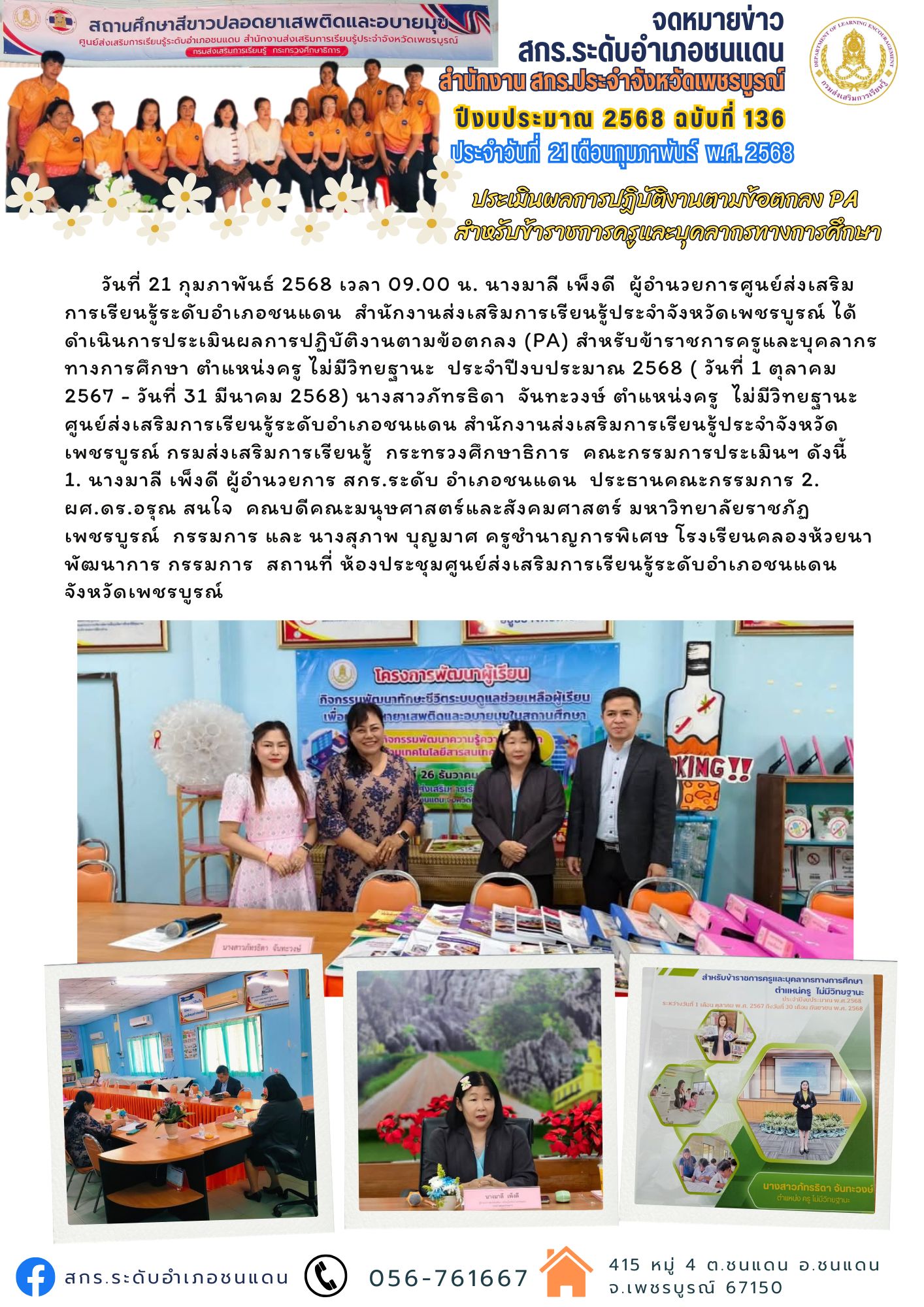 วันที่ 21 กุมภาพันธ์ 2568 เวลา 09.00 น. นางมาลี เพ็งดี ผู้อำนวยการศูนย์ส่งเสริมการเรียนรู้ระดับอำเภอชนแดน สำนักงานส่งเสริมการเรียนรู้ประจำจังหวัดเพชรบูรณ์ ได้ดำเนินการประเมินผลการปฏิบัติงานตามข้อตกลง (PA) สำหรับข้าราชการครูและบุคลากรทางการศึกษา ตำแหน่งครู ไม่มีวิทยฐานะ ประจำปีงบประมาณ 2568 ( วันที่ 1 ตุลาคม 2567 - วันที่ 31 มีนาคม 2568) นางสาวภัทรธิดา จันทะวงษ์ ตำแหน่งครู ไม่มีวิทยฐานะ ศูนย์ส่งเสริมการเรียนรู้ระดับอำเภอชนแดน สำนักงานส่งเสริมการเรียนรู้ประจำจังหวัดเพชรบูรณ์ กรมส่งเสริมการเรียนรู้ กระทรวงศึกษาธิการ คณะกรรมการประเมินฯ ดังนี้