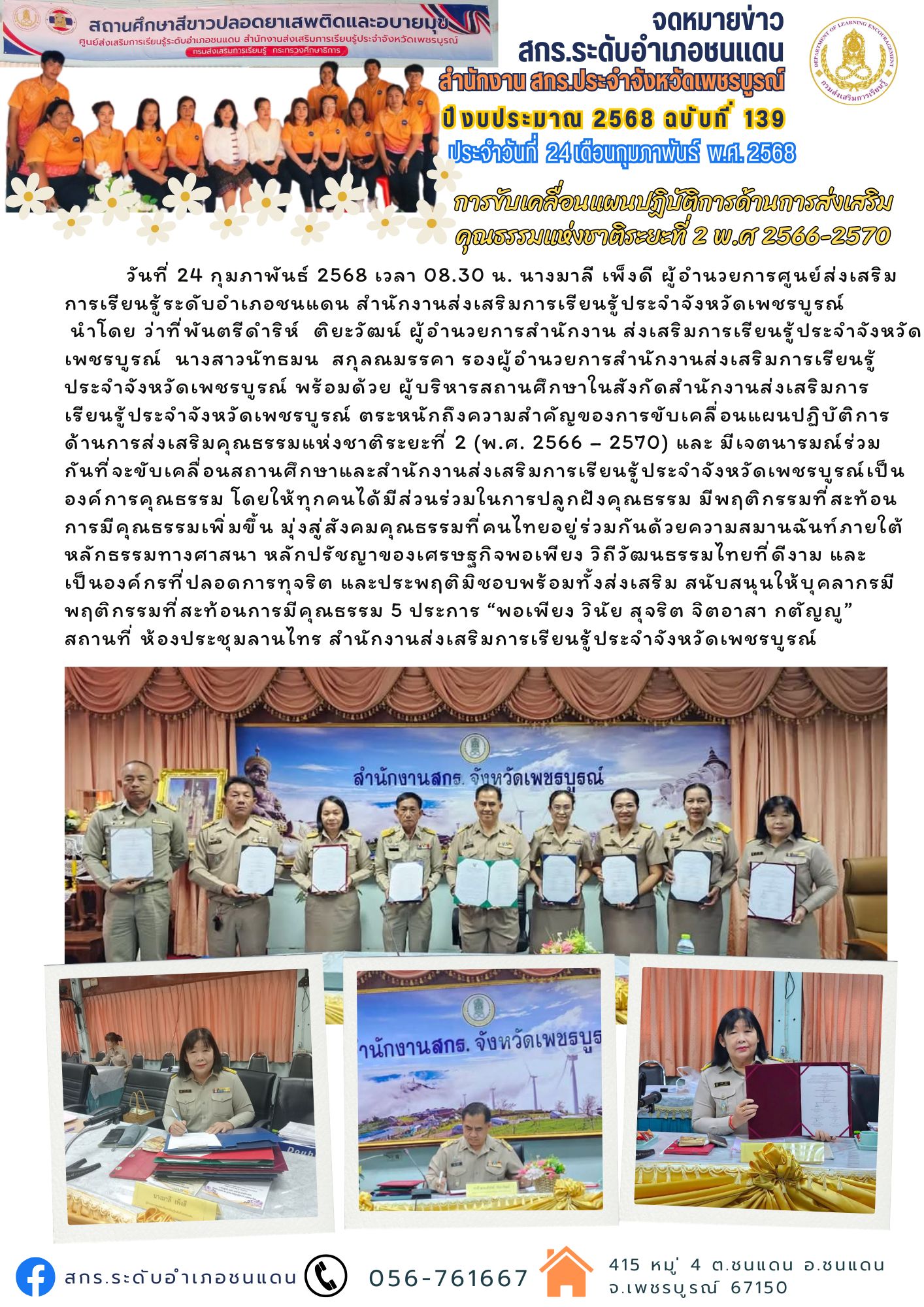 นำโดย ?ว่าที่พันตรีดำริห์ ติยะวัฒน์ ผู้อำนวยการสำนักงาน ส่งเสริมการเรียนรู้ประจำจังหวัดเพชรบูรณ์ นางสาวนัทธมน สกุลณมรรคา รองผู้อำนวยการสำนักงานส่งเสริมการเรียนรู้ประจำจังหวัดเพชรบูรณ์ พร้อมด้วย ผู้บริหารสถานศึกษาในสังกัดสำนักงานส่งเสริมการเรียนรู้ประจำจังหวัดเพชรบูรณ์ ตระหนักถึงความสำคัญของการขับเคลื่อนแผนปฏิบัติการด้านการส่งเสริมคุณธรรมแห่งชาติระยะที่ 2 (พ.ศ. 2566 – 2570) และ มีเจตนารมณ์ร่วมกันที่จะขับเคลื่อนสถานศึกษาและสำนักงานส่งเสริมการเรียนรู้ประจำจังหวัดเพชรบูรณ์เป็นองค์การคุณธรรม โดยให้ทุกคนได้มีส่วนร่วมในการปลูกฝังคุณธรรม มีพฤติกรรมที่สะท้อนการมีคุณธรรมเพิ่มขึ้น มุ่งสู่สังคมคุณธรรมที่คนไทยอยู่ร่วมกันด้วยความสมานฉันท์ภายใต้หลักธรรมทางศาสนา หลักปรัชญาของเศรษฐกิจพอเพียง วิถีวัฒนธรรมไทยที่ดีงาม และเป็นองค์กรที่ปลอดการทุจริต และประพฤติมิชอบพร้อมทั้งส่งเสริม สนับสนุนให้บุคลากรมีพฤติกรรมที่สะท้อนการมีคุณธรรม 5 ประการ “พอเพียง วินัย สุจริต จิตอาสา กตัญญู” สถานที่ ห้องประชุมลานไทร สำนักงานส่งเสริมการเรียนรู้ประจำจังหวัดเพชรบูรณ์