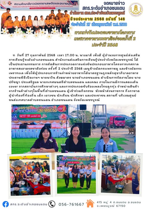 วันที่ 27 กุมภาพันธ์ 2568 เวลา 17.00 น. นางมาลี เพ็งดี ผู้อำนวยการศูนย์ส่งเสริมการเรียนรู้ระดับอำเภอชนแดน สำนักงานส่งเสริมการเรียนรู้ประจำจังหวัดเพชรบูรณ์ ได้เป็นประธานกรรมการ การตัดสินการประกวดการแข่งขันประกอบอาหารโครงการเทศกาลอาหารสะอาดรสชาติอร่อย ครั้งที่ 2 ประจำปี 2568 เมนูข้าวผัดกระเพราหมู และข้าวผัดกระเพราทะเล เพื่อให้ผู้ประกอบการร้านจำหน่ายอาหารได้มาตรฐานถูกหลักสุขาภิบาลอาหาร ประธานพิธีเปิดงานฯ นายนาวิน สังฆมาตร นายอำเภอชนแดน ดำเนินการจัดงานโดย นายปรัชญา ประเสริฐผล นายกเทศมนตรีตำบลชนแดน และคณะ ภายในงานมีการแสดงเต้น cover จากสถาบันการศึกษาต่างๆ และการประกวดขับร้องเพลงไทยลูกทุ่ง จำหน่ายสินค้าจากร้านค้าต่างๆในพื้นที่ตำบลชนแดน ผู้เข้าร่วมกิจกรรม หัวหน้าส่วนราชการ กิ่งกาชาด ผู้นำท้องที่ท้องถิ่น เด็ก เยาวชน นักเรียน นักศึกษา และประชาชน สถานที่ บริเวณศูนย์ขนส่งเทศบาลตำบลชนแดน อำเภอชนแดน จังหวัดเพชรบูรณ์