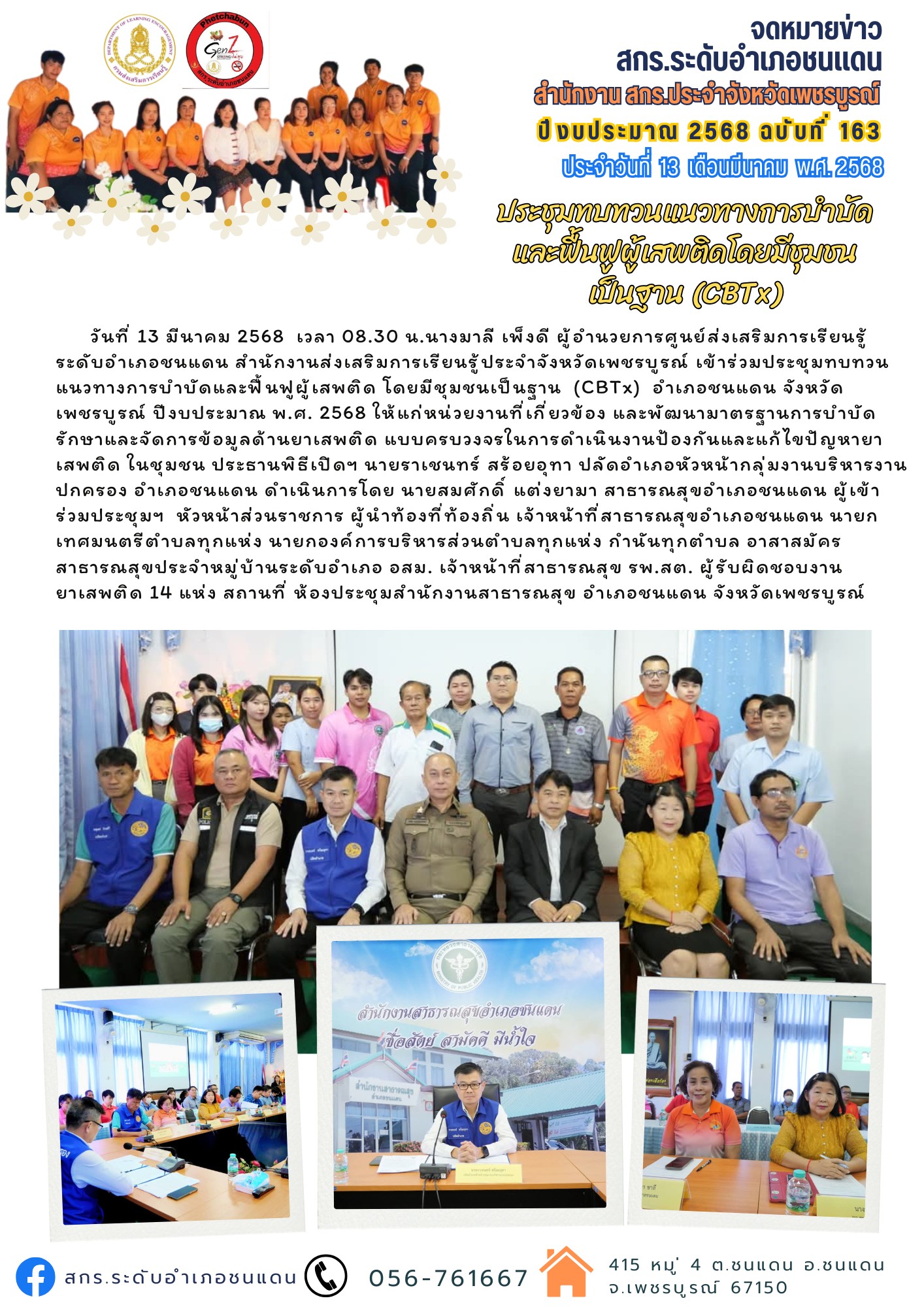 การประชุมทบทวนแนวทางการบำบัดและฟื้นฟูผู้เสพติด โดยมีชุมชนเป็นฐาน (CBTx) อำเภอชนแดน จังหวัดเพชรบูรณ์ ปีงบประมาณ พ.ศ. 2568