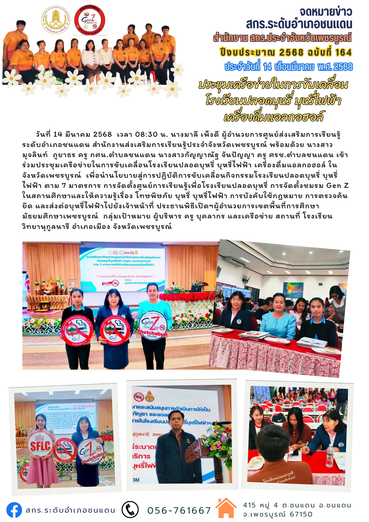 วันที่ 14 มีนาคม 2568 เวลา 08:30 น. นางมาลี เพ็งดี ผู้อำนวยการศูนย์ส่งเสริมการเรียนรู้ระดับอำเภอชนแดน สำนักงานส่งเสริมการเรียนรู้ประจำจังหวัดเพชรบูรณ์ พร้อมด้วย นางสาวมุจลินท์ ภูยาธร ครู กศน.ตำบลชนแดน นางสาวกัญญาณัฐ จันปัญญา ครู ศรช.ตำบลชนแดน เข้าร่วมประชุมเครือข่ายในการขับเคลื่อนโรงเรียนปลอดบุหรี่ บุหรี่ไฟฟ้า เครื่องดื่มแอลกอฮอล์ ในจังหวัดเพชรบูรณ์ เพื่อนำนโยบายสู่การปฏิบัติการขับเคลื่อนกิจกรรมโรงเรียนปลอดบุหรี่ บุหรี่ไฟฟ้า ตาม 7 มาตรการ การจัดตั้งศูนย์การเรียนรู้เพื่อโรงเรียนปลอดบุหรี่ การจัดตั้งชมรม Gen Z ในสถานศึกษาและให้ความรู้เรื่อง โทษพิษภัย บุหรี่ บุหรี่ไฟฟ้า การบังคับใช้กฎหมาย การตรวจค้นยึด และส่งต่อบุหรี่ไฟฟ้าไปยังเจ้าหน้าที่ ประธานพิธีเปิดฯผู้อำนวยการเขตพื้นที่การศึกษามัธยมศึกษาเพชรบูรณ์ กลุ่มเป้าหมาย ผู้บริหาร ครู บุคลากร และเครือข่าย สถานที่ โรงเรียนวิทยานุกูลนารี อำเภอเมือง จังหวัดเพชรบูรณ์