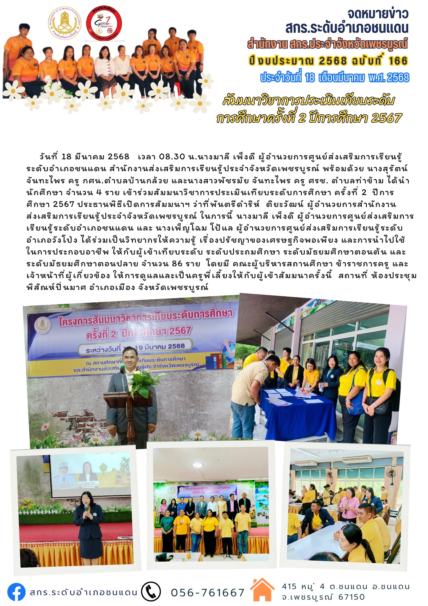วันที่ 18 มีนาคม 2568 เวลา 08.30 น.นางมาลี เพ็งดี ผู้อำนวยการศูนย์ส่งเสริมการเรียนรู้ระดับอำเภอชนแดน สำนักงานส่งเสริมการเรียนรู้ประจำจังหวัดเพชรบูรณ์ พร้อมด้วย นางสุรัตน์ จันทะไพร ครู กศน.ตำบลบ้านกล้วย และนางสาวพัชรมัย จันทะไพร ครู ศรช. ตำบลท่าข้าม ได้นำนักศึกษา จำนวน 4 ราย เข้าร่วมสัมมนาวิชาการประเมินเทียบระดับการศึกษา ครั้งที่ 2 ปีการศึกษา 2567 ประธานพิธีเปิดการสัมมนาฯ ว่าที่พันตรีดำริห์ ติยะวัฒน์ ผู้อำนวยการสำนักงานส่งเสริมการเรียนรู้ประจำจังหวัดเพชรบูรณ์ ในการนี้ นางมาลี เพ็งดี ผู้อำนวยการศูนย์ส่งเสริมการเรียนรู้ระดับอำเภอชนแดน และ นางเพ็ญโฉม โป้แล ผู้อำนวยการศูนย์ส่งเสริมการเรียนรู้ระดับอำเภอวังโป่ง ได้ร่วมเป็นวิทยากรให้ความรู้ เรื่องปรัชญาของเศรษฐกิจพอเพียง และการนำไปใช้ในการประกอบอาชีพ ให้กับผู้เข้าเทียบระดับ ระดับประถมศึกษา ระดับมัธยมศึกษาตอนต้น และระดับมัธยมศึกษาตอนปลาย จำนวน 86 ราย โดยมี คณะผู้บริหารสถานศึกษา ข้าราชการครู และเจ้าหน้าที่ผู้เกี่ยวข้อง ให้การดูแลและเป็นครูพี่เลี้ยงให้กับผู้เข้าสัมมนาครั้งนี้ สถานที่ ห้องประชุมพิสัณห์ปิ่นมาศ อำเภอเมือง จังหวัดเพชรบูรณ์