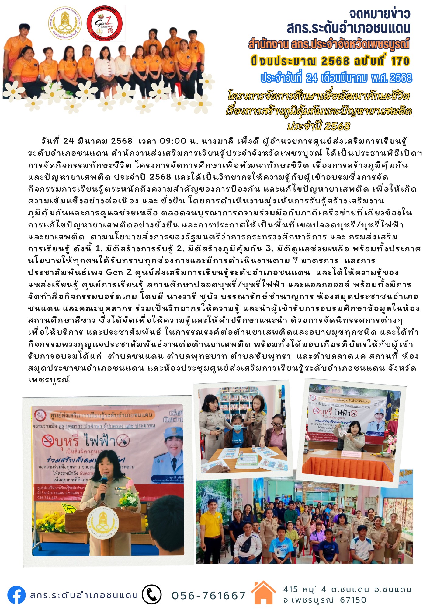 วันที่ 24 มีนาคม 2568 เวลา 09:00 น. นางมาลี เพ็งดี ผู้อำนวยการศูนย์ส่งเสริมการเรียนรู้ระดับอำเภอชนแดน สำนักงานส่งเสริมการเรียนรู้ประจำจังหวัดเพชรบูรณ์ ได้เป็นประธานพิธีเปิดฯ การจัดกิจกรรมทักษะชีวิต โครงการจัดการศึกษาเพื่อพัฒนาทักษะชีวิต เรื่องการสร้างภูมิคุ้มกันและปัญหายาเสพติด ประจำปี 2568 และได้เป็นวิทยากรให้ความรู้กับผู้เข้าอบรมซึ่งการจัดกิจกรรมการเรียนรู้ตระหนักถึงความสำคัญของการป้องกัน และแก้ไขปัญหายาเสพติด เพื่อให้เกิดความเข้มแข็งอย่างต่อเนื่อง และ ยั่งยืน โดยการดำเนินงานมุ่งเน้นการรับรู้สร้างเสริมงานภูมิคุ้มกันและการดูแลช่วยเหลือ ตลอดจนบูรณาการความร่วมมือกับภาคีเครือข่ายที่เกี่ยวข้องในการแก้ไขปัญหายาเสพติดอย่างยั่งยืน และการประกาศให้เป็นพื้นที่เขตปลอดบุหรี่/บุหรี่ไฟฟ้า และยาเสพติด ตามนโยบายสั่งการของรัฐมนตรีว่าการกระทรวงศึกษาธิการ และ กรมส่งเสริมการเรียนรู้ ดังนี้ 1. มิติสร้างการรับรู้ 2. มิติสร้างภูมิคุ้มกัน 3. มิติดูแลช่วยเหลือ พร้อมทั้งประกาศนโยบายให้ทุกคนได้รับทราบทุกช่องทางและมีการดำเนินงานตาม 7 มาตรการ และการประชาสัมพันธ์เพจ Gen Z ศูนย์ส่งเสริมการเรียนรู้ระดับอำเภอชนแดน และได้ให้ความรู้ของแหล่งเรียนรู้ ศูนย์การเรียนรู้ สถานศึกษาปลอดบุหรี่/บุหรี่ไฟฟ้า และแอลกอฮอล์ พร้อมทั้งมีการจัดทำสื่อกิจกรรมบอร์ดเกม โดยมี นางวารี ชูบัว บรรณารักษ์ชำนาญการ ห้องสมุดประชาชนอำเภอชนแดน และคณะบุคลากร ร่วมเป็นวิทยากรให้ความรู้ และนำผู้เข้ารับการอบรมศึกษาข้อมูลในห้องสถานศึกษาสีขาว ซึ่งได้จัดเพื่อให้ความรู้และให้คำปรึกษาแนะนำ ด้วยการจัดนิทรรศการต่างๆ เพื่อให้บริการ และประชาสัมพันธ์ ในการรณรงค์ต่อต้านยาเสพติดและอบายมุขทุกชนิด และได้ทำกิจกรรมพวงกุญแจประชาสัมพันธ์งานต่อต้านยาเสพติด พร้อมทั้งได้มอบเกียรติบัตรให้กับผู้เข้ารับการอบรมได้แก่ ตำบลชนแดน ตำบลพุทธบาท ตำบลซับพุทรา และตำบลลาดแค สถานที่ ห้องสมุดประชาชนอำเภอชนแดน และห้องประชุมศูนย์ส่งเสริมการเรียนรู้ระดับอำเภอชนแดน จังหวัดเพชรบูรณ์