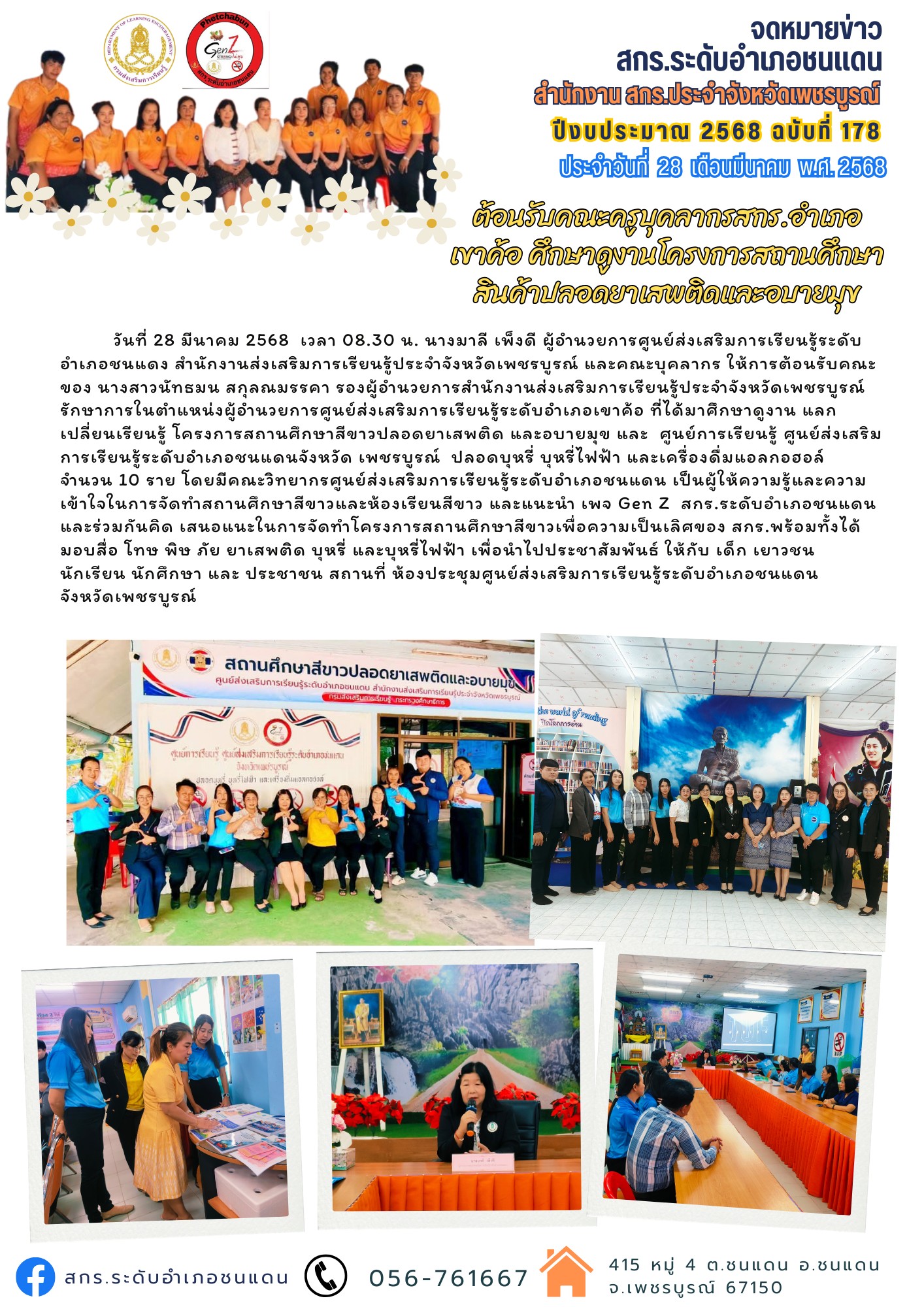 วันที่ 28 มีนาคม 2568 เวลา 08.30 น. นางมาลี เพ็งดี ผู้อำนวยการศูนย์ส่งเสริมการเรียนรู้ระดับอำเภอชนแดง สำนักงานส่งเสริมการเรียนรู้ประจำจังหวัดเพชรบูรณ์ และคณะบุคลากร ให้การต้อนรับคณะของ นางสาวนัทธมน สกุลณมรรคา รองผู้อำนวยการสำนักงานส่งเสริมการเรียนรู้ประจำจังหวัดเพชรบูรณ์ รักษาการในตำแหน่งผู้อำนวยการศูนย์ส่งเสริมการเรียนรู้ระดับอำเภอเขาค้อ ที่ได้มาศึกษาดูงาน แลกเปลี่ยนเรียนรู้ โครงการสถานศึกษาสีขาวปลอดยาเสพติด และอบายมุข และ ศูนย์การเรียนรู้ ศูนย์ส่งเสริมการเรียนรู้ระดับอำเภอชนแดนจังหวัด เพชรบูรณ์ ปลอดบุหรี่ บุหรี่ไฟฟ้า และเครื่องดื่มแอลกอฮอล์ จำนวน 10 ราย โดยมีคณะวิทยากรศูนย์ส่งเสริมการเรียนรู้ระดับอำเภอชนแดน เป็นผู้ให้ความรู้และความเข้าใจในการจัดทำสถานศึกษาสีขาวและห้องเรียนสีขาว และแนะนำ เพจ Gen Z สกร.ระดับอำเภอชนแดน และร่วมกันคิด เสนอแนะในการจัดทำโครงการสถานศึกษาสีขาวเพื่อความเป็นเลิศของ สกร.พร้อมทั้งได้มอบสื่อ โทษ พิษ ภัย ยาเสพติด บุหรี่ และบุหรี่ไฟฟ้า เพื่อนำไปประชาสัมพันธ์ ให้กับ เด็ก เยาวชน นักเรียน นักศึกษา และ ประชาชน สถานที่ ห้องประชุมศูนย์ส่งเสริมการเรียนรู้ระดับอำเภอชนแดน จังหวัดเพชรบูรณ์