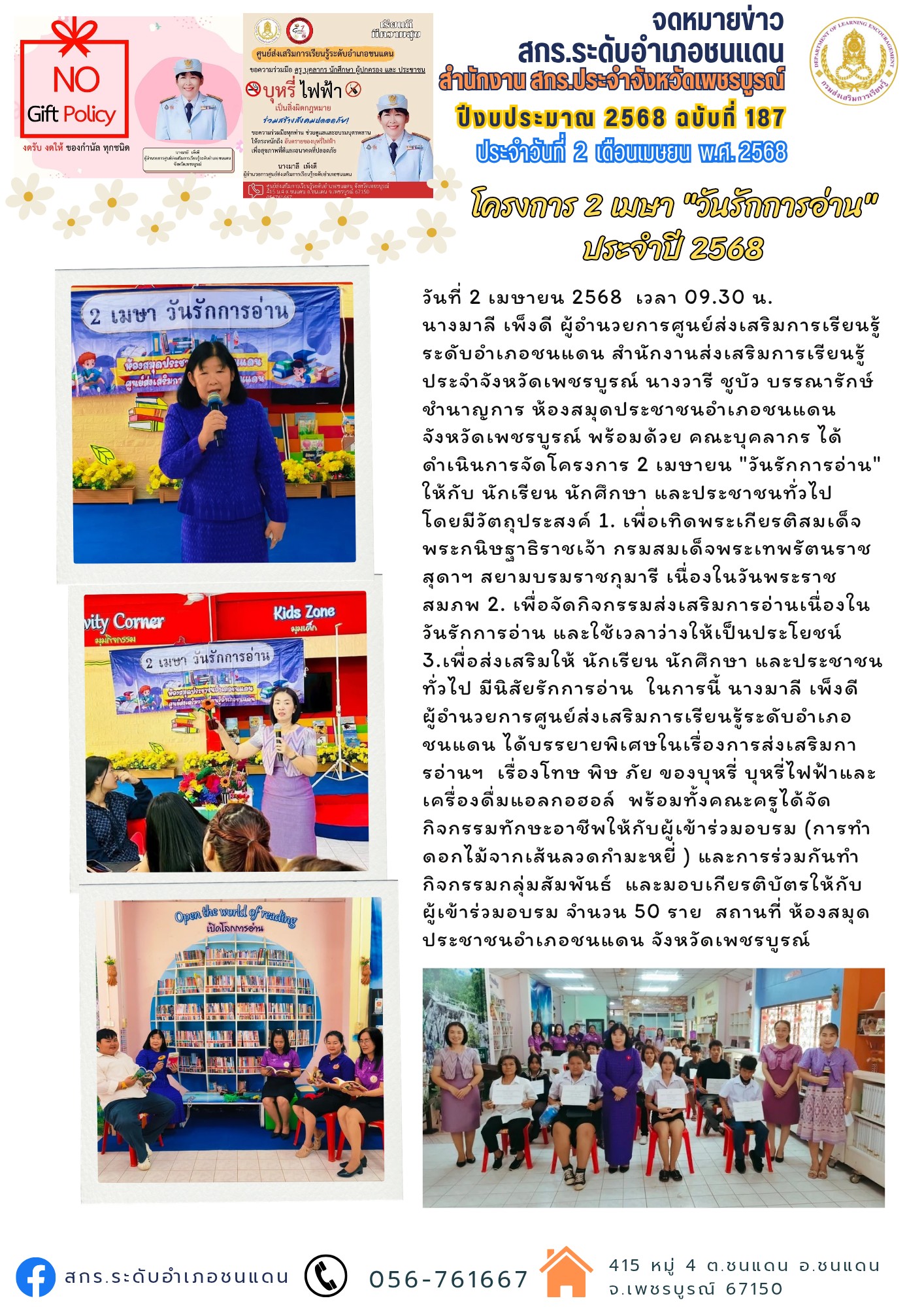 นางมาลี เพ็งดี ผู้อำนวยการศูนย์ส่งเสริมการเรียนรู้ระดับอำเภอชนแดน สำนักงานส่งเสริมการเรียนรู้ประจำจังหวัดเพชรบูรณ์ นางวารี ชูบัว บรรณารักษ์ชำนาญการ ห้องสมุดประชาชนอำเภอชนแดน จังหวัดเพชรบูรณ์ พร้อมด้วย คณะบุคลากร ได้ดำเนินการจัดโครงการ 2 เมษายน "วันรักการอ่าน" ให้กับ นักเรียน นักศึกษา และประชาชนทั่วไป