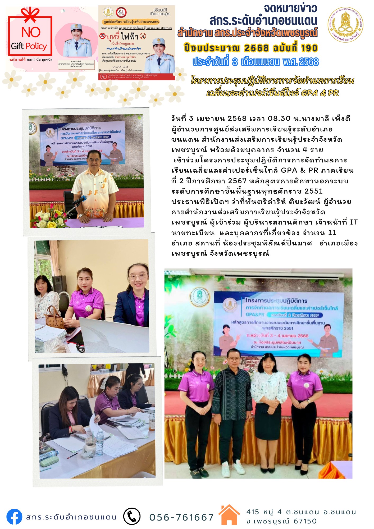 วันที่ 3-4 เมษายน 2568 นางมาลี เพ็งดี ผู้อำนวยการศูนย์ส่งเสริมการเรียนรู้ระดับอำเภอชนแดน สำนักงานส่งเสริมการเรียนรู้ประจำจังหวัดเพชรบูรณ์ พร้อมด้วยบุคลากร จำนวน 4 ราย เข้าร่วมโครงการประชุมปฏิบัติการการจัดทำผลการเรียนเฉลี่ยและค่าเปอร์เซ็นไทล์ GPA & PR ภาคเรียนที่ 2 ปีการศึกษา 2567 หลักสูตรการศึกษานอกระบบระดับการศึกษาขั้นพื้นฐานพุทธศักราช 2551