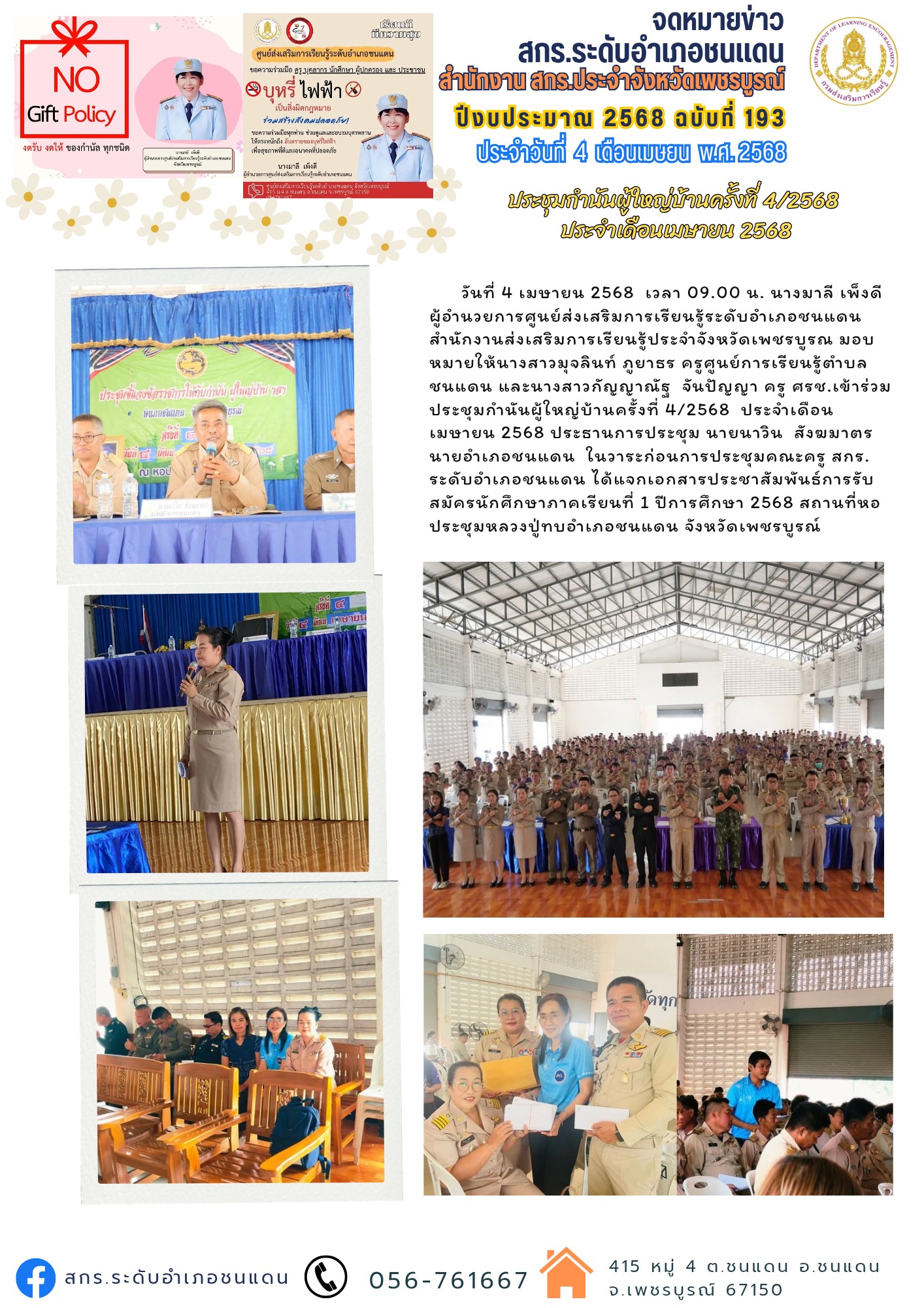 วันที่ 4 เมษายน 2568 เวลา 09.00 น. นางมาลี เพ็งดี ผู้อำนวยการศูนย์ส่งเสริมการเรียนรู้ระดับอำเภอชนแดน สำนักงานส่งเสริมการเรียนรู้ประจำจังหวัดเพชรบูรณ์ มอบหมายให้นางสาวมุจลินท์ ภูยาธร ครูศูนย์การเรียนรู้ตำบลชนแดน และนางสาวกัญญาณัฐ จันปัญญา ครู ศรช.เข้าร่วมประชุมกำนันผู้ใหญ่บ้านครั้งที่ 4/2568 ประจำเดือนเมษายน 2568 ประธานการประชุม นายนาวิน สังฆมาตร นายอำเภอชนแดน ในวาระก่อนการประชุมคณะครู สกร.ระดับอำเภอชนแดน ได้แจกเอกสารประชาสัมพันธ์การรับสมัครนักศึกษาภาคเรียนที่ 1 ปีการศึกษา 2568 สถานที่หอประชุมหลวงปู่ทบอำเภอชนแดน จังหวัดเพชรบูรณ์