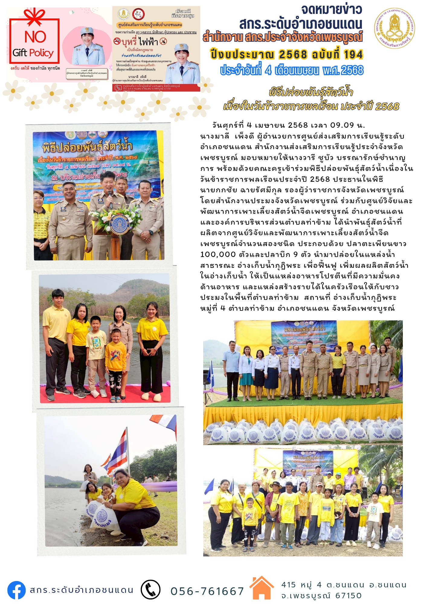 นางมาลี เพ็งดี ผู้อำนวยการศูนย์ส่งเสริมการเรียนรู้ระดับอำเภอชนแดน สำนักงานส่งเสริมการเรียนรู้ประจำจังหวัดเพชรบูรณ์ มอบหมายให้นางวารี ชูบัว บรรณารักษ์ชำนาญการ พร้อมด้วยคณะครูเข้าร่วมพิธีปล่อยพันธุ์สัตว์น้ำเนื่องในวันข้าราชการพลเรือนประจำปี 2568 ประธานในพิธีนายกกชัย ฉายรัศมีกุล รองผู้ว่าราชการจังหวัดเพชรบูรณ์ โดยสำนักงานประมงจังหวัดเพชรบูรณ์ ร่วมกับศูนย์วิจัยและพัฒนาการเพาะเลี้ยงสัตว์น้ำจืดเพชรบูรณ์ อำเภอชนแดน และองค์การบริหารส่วนตำบลท่าข้าม ได้นำพันธุ์สัตว์น้ำที่ผลิตจากศูนย์วิจัยและพัฒนาการเพาะเลี้ยงสัตว์น้ำจืดเพชรบูรณ์จำนวนสองชนิด ประกอบด้วย ปลาตะเพียนขาว 100,000 ตัวและปลาบึก 9 ตัว นำมาปล่อยในแหล่งน้ำสาธารณะ อ่างเก็บน้ำกุฎิพระ เพื่อฟื้นฟู เพิ่มผลผลิตสัตว์น้ำในอ่างเก็บน้ำ ให้เป็นแหล่งอาหารโปรตีนที่มีความมั่นคงด้านอาหาร และแหล่งสร้างรายได้ในครัวเรือนให้กับชาวประมงในพื้นที่ตำบลท่าข้าม สถานที่ อ่างเก็บน้ำกุฏิพระ หมู่ที่ 4 ตำบลท่าข้าม อำเภอชนแดน จังหวัดเพชรบูรณ์