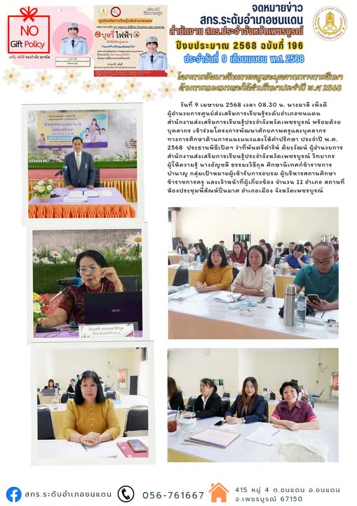 วันที่ 9 เมษายน 2568 นางมาลี เพ็งดี ผู้อำนวยการศูนย์ส่งเสริมการเรียนรู้ระดับอำเภอชนแดน สำนักงานส่งเสริมการเรียนรู้ประจำจังหวัดเพชรบูรณ์ พร้อมด้วยบุคลากร เข้าร่วมโครงการพัฒนาศักยภาพครูและบุคลากรทางการศึกษาด้านการแนะแนวและให้คำปรึกษา ประจำปี พ.ศ. 2568 ประธานพิธีเปิดฯ ว่าที่พันตรีดำริห์ ติยะวัฒน์ ผู้อำนวยการสำนักงานส่งเสริมการเรียนรู้ประจำจังหวัดเพชรบูรณ์ วิทยากรผู้ให้ความรู้ นางอัญชลี ธรรมะวิธีกุล ศึกษานิเทศก์ข้าราชการบำนาญ กลุ่มเป้าหมายผู้เข้ารับการอบรม ผู้บริหารสถานศึกษา ข้าราชการครู และเจ้าหน้าที่ผู้เกี่ยวข้อง จำนวน 11 อำเภอ สถานที่ ห้องประชุมพี่สัณห์ปิ่นมาศ อำเภอเมือง จังหวัดเพชรบูรณ์