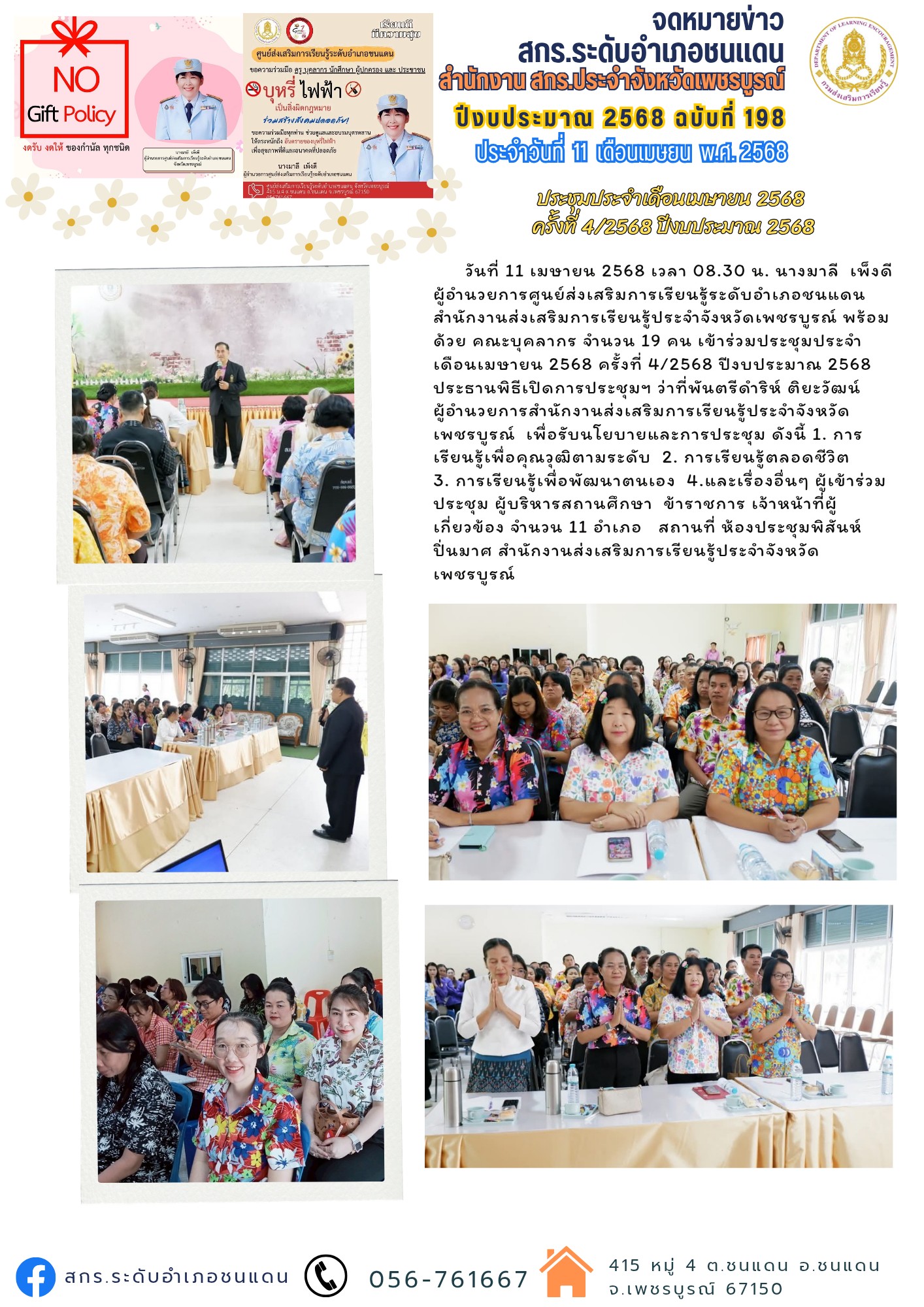 วันที่ 11 เมษายน 2568 เวลา 08.30 น. นางมาลี เพ็งดี ผู้อำนวยการศูนย์ส่งเสริมการเรียนรู้ระดับอำเภอชนแดน สำนักงานส่งเสริมการเรียนรู้ประจำจังหวัดเพชรบูรณ์ พร้อมด้วย คณะบุคลากร จำนวน 19 คน เข้าร่วมประชุมประจำเดือนเมษายน 2568 ครั้งที่ 4/2568 ปีงบประมาณ 2568 ประธานพิธีเปิดการประชุมฯ ว่าที่พันตรีดำริห์ ติยะวัฒน์ ผู้อำนวยการสำนักงานส่งเสริมการเรียนรู้ประจำจังหวัดเพชรบูรณ์ เพื่อรับนโยบายและการประชุม ดังนี้ 1. การเรียนรู้เพื่อคุณวุฒิตามระดับ 2. การเรียนรู้ตลอดชีวิต 3. การเรียนรู้เพื่อพัฒนาตนเอง 4.และเรื่องอื่นๆ ผู้เข้าร่วมประชุม ผู้บริหารสถานศึกษา ข้าราชการ เจ้าหน้าที่ผู้เกี่ยวข้อง จำนวน 11 อำเภอ สถานที่ ห้องประชุมพิสันห์ปิ่นมาศ สำนักงานส่งเสริมการเรียนรู้ประจำจังหวัดเพชรบูรณ์