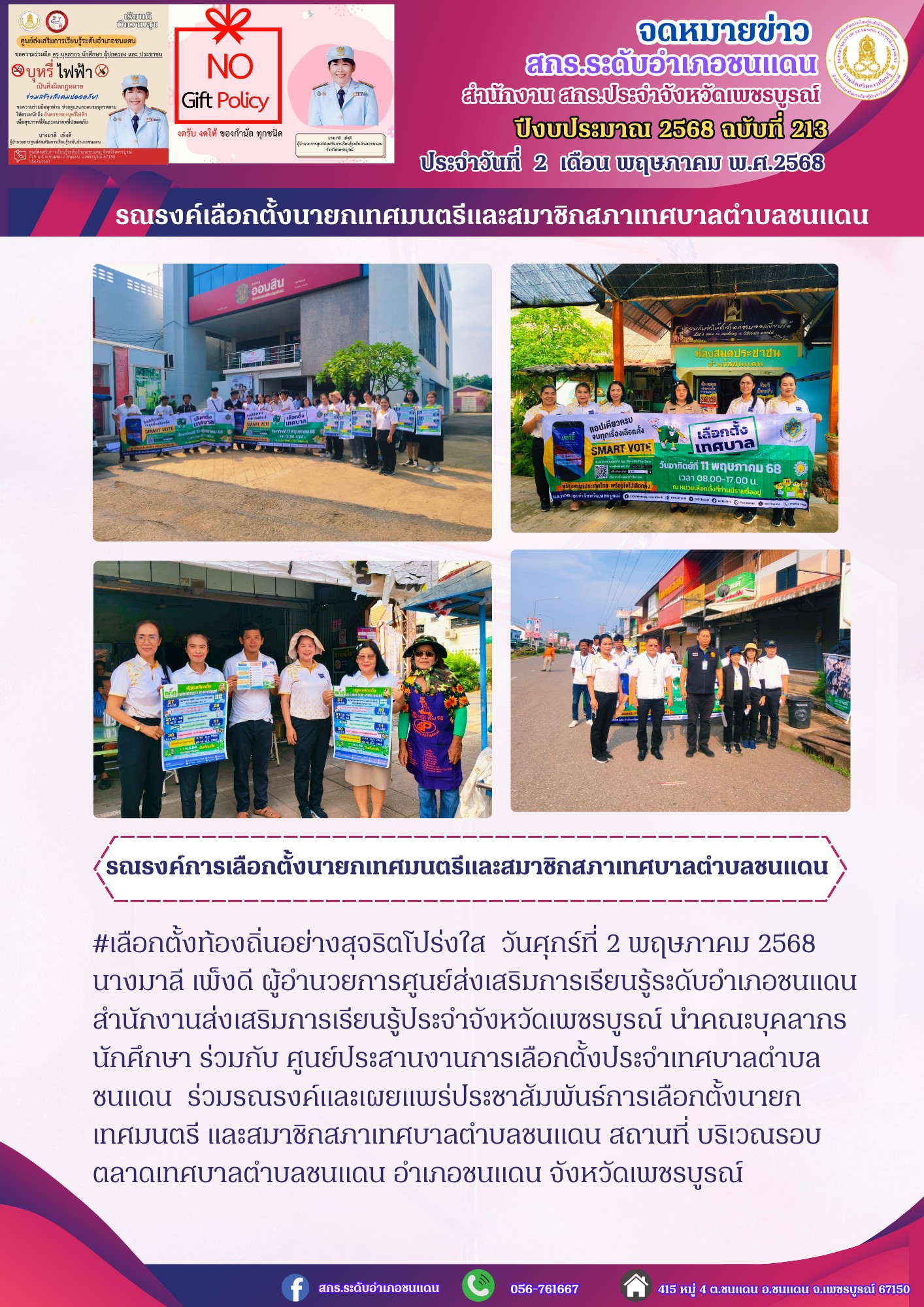 วันศุกร์ที่ 2 พฤษภาคม 2568 นางมาลี เพ็งดี ผู้อำนวยการศูนย์ส่งเสริมการเรียนรู้ระดับอำเภอชนแดน สำนักงานส่งเสริมการเรียนรู้ประจำจังหวัดเพชรบูรณ์ นำคณะบุคลากร นักศึกษา ร่วมกับ ศูนย์ประสานงานการเลือกตั้งประจำเทศบาลตำบลชนแดน ร่วมรณรงค์และเผยแพร่ประชาสัมพันธ์การเลือกตั้งนายกเทศมนตรี และสมาชิกสภาเทศบาลตำบลชนแดน สถานที่ บริเวณรอบตลาดเทศบาลตำบลชนแดน อำเภอชนแดน จังหวัดเพชรบูรณ์