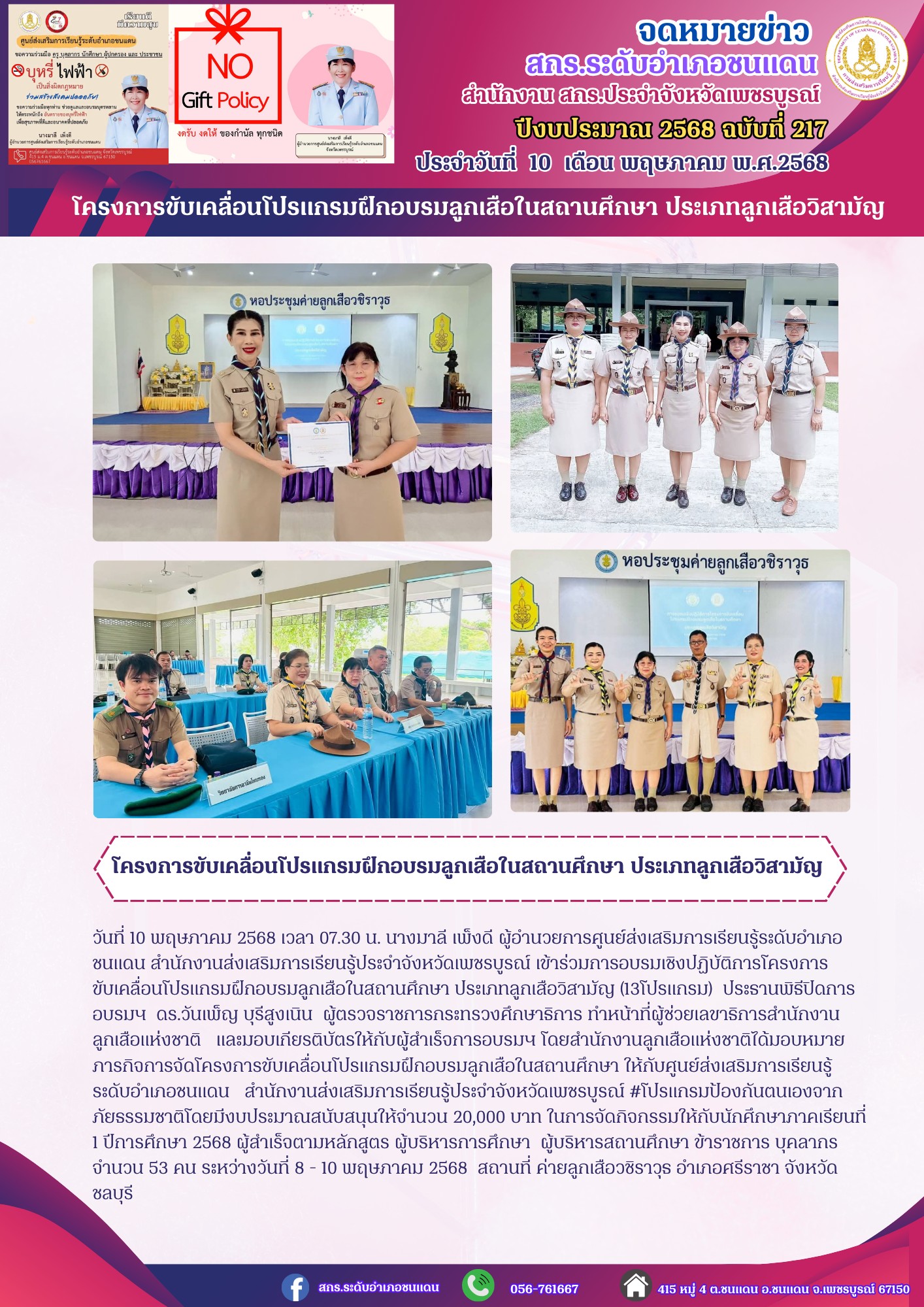 วันที่ 10 พฤษภาคม 2568 เวลา 07.30 น. นางมาลี เพ็งดี ผู้อำนวยการศูนย์ส่งเสริมการเรียนรู้ระดับอำเภอชนแดน สำนักงานส่งเสริมการเรียนรู้ประจำจังหวัดเพชรบูรณ์ เข้าร่วมการอบรมเชิงปฏิบัติการโครงการขับเคลื่อนโปรแกรมฝึกอบรมลูกเสือในสถานศึกษา ประเภทลูกเสือวิสามัญ (13โปรแกรม) ประธานพิธีปิดการอบรมฯ ดร.วันเพ็ญ บุรีสูงเนิน ผู้ตรวจราชการกระทรวงศึกษาธิการ ทำหน้าที่ผู้ช่วยเลขาธิการสำนักงานลูกเสือแห่งชาติ และมอบเกียรติบัตรให้กับผู้สำเร็จการอบรมฯ โดยสำนักงานลูกเสือแห่งชาติได้มอบหมายภารกิจการจัดโครงการขับเคลื่อนโปรแกรมฝึกอบรมลูกเสือในสถานศึกษา ให้กับศูนย์ส่งเสริมการเรียนรู้ระดับอำเภอชนแดน สำนักงานส่งเสริมการเรียนรู้ประจำจังหวัดเพชรบูรณ์ #โปรแกรมป้องกันตนเองจากภัยธรรมชาติโดยมีงบประมาณสนับสนุนให้จำนวน 20,000 บาท ในการจัดกิจกรรมให้กับนักศึกษาภาคเรียนที่ 1 ปีการศึกษา 2568 ผู้สำเร็จตามหลักสูตร ผู้บริหารการศึกษา ผู้บริหารสถานศึกษา ข้าราชการ บุคลากร จำนวน 53 คน ระหว่างวันที่ 8 - 10 พฤษภาคม 2568 สถานที่ ค่ายลูกเสือวชิราวุธ อำเภอศรีราชา จังหวัดชลบุรี