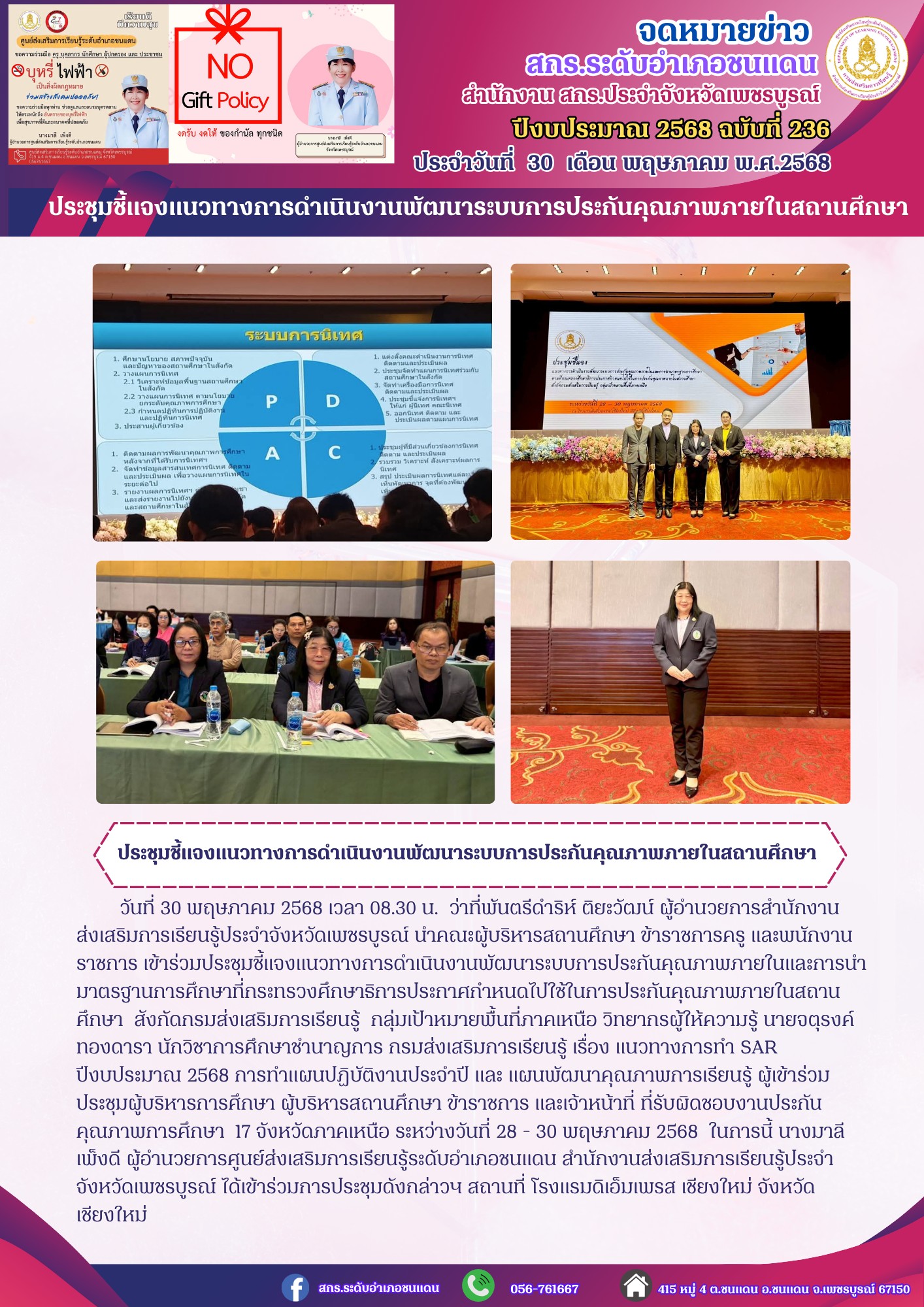 ว่าที่พันตรีดำริห์ ติยะวัฒน์ ผู้อำนวยการสำนักงานส่งเสริมการเรียนรู้ประจำจังหวัดเพชรบูรณ์ นำคณะผู้บริหารสถานศึกษา ข้าราชการครู และพนักงานราชการ เข้าร่วมประชุมชี้แจงแนวทางการดำเนินงานพัฒนาระบบการประกันคุณภาพภายในและการนำมาตรฐานการศึกษาที่กระทรวงศึกษาธิการประกาศกำหนดไปใช้ในการประกันคุณภาพภายในสถานศึกษา สังกัดกรมส่งเสริมการเรียนรู้ กลุ่มเป้าหมายพื้นที่ภาคเหนือ วิทยากรผู้ให้ความรู้ นายจตุรงค์ ทองดารา นักวิชาการศึกษาชำนาญการ กรมส่งเสริมการเรียนรู้ เรื่อง แนวทางการทำ SAR ปีงบประมาณ 2568 การทำแผนปฏิบัติงานประจำปี และ แผนพัฒนาคุณภาพการเรียนรู้ ผู้เข้าร่วมประชุมผู้บริหารการศึกษา ผู้บริหารสถานศึกษา ข้าราชการ และเจ้าหน้าที่ ที่รับผิดชอบงานประกันคุณภาพการศึกษา 17 จังหวัดภาคเหนือ ระหว่างวันที่ 28 - 30 พฤษภาคม 2568 #ในการนี้ นางมาลี เพ็งดี ผู้อำนวยการศูนย์ส่งเสริมการเรียนรู้ระดับอำเภอชนแดน สำนักงานส่งเสริมการเรียนรู้ประจำจังหวัดเพชรบูรณ์ ได้เข้าร่วมการประชุมดังกล่าวฯ สถานที่ โรงแรมดิเอ็มเพรส เชียงใหม่ จังหวัดเชียงใหม่