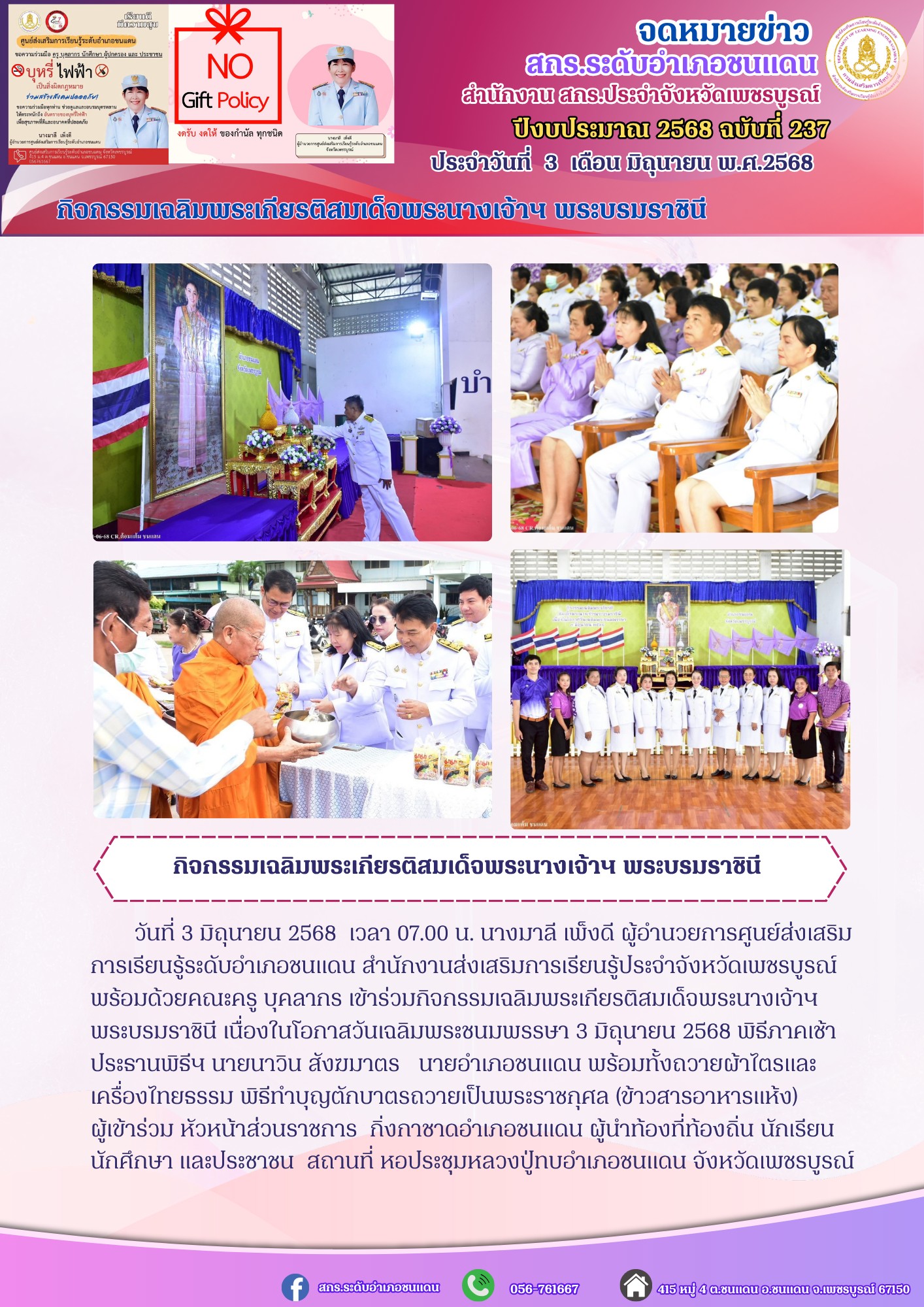 วันที่ 3 มิถุนายน 2568 เวลา 17.30 น. นางมาลี เพ็งดี ผู้อำนวยการศูนย์ส่งเสริมการเรียนรู้ระดับอำเภอชนแดน สำนักงานส่งเสริมการเรียนรู้ประจำจังหวัดเพชรบูรณ์ พร้อมด้วย นางสาวลดาวรรณ์ สุทธิพันธ์ และ นางสาวมุจลินท์ ภูยาธร ครูศูนย์การเรียนรู้ เข้าร่วมกิจกรรมเฉลิมพระเกียรติสมเด็จพระนางเจ้าฯ พระบรมราชินี เนื่องในโอกาสวันเฉลิมพระชนมพรรษา 3 มิถุนายน 2568 พิธีภาคค่ำ ประธานพิธีฯ นายนาวิน สังฆมาตร นายอำเภอชนแดน ร่วมพิธีถวายเครื่องราชสักการะและวางพานพุ่มและพิธีจุดเทียนถวายพระพรชัยมงคล ผู้เข้าร่วม หัวหน้าส่วนราชการ กิ่งกาชาดอำเภอชนแดน ผู้นำท้องที่ท้องถิ่น นักเรียน นักศึกษา และประชาชน สถานที่ หอประชุมหลวงปู่ทบอำเภอชนแดน จังหวัดเพชรบูรณ์