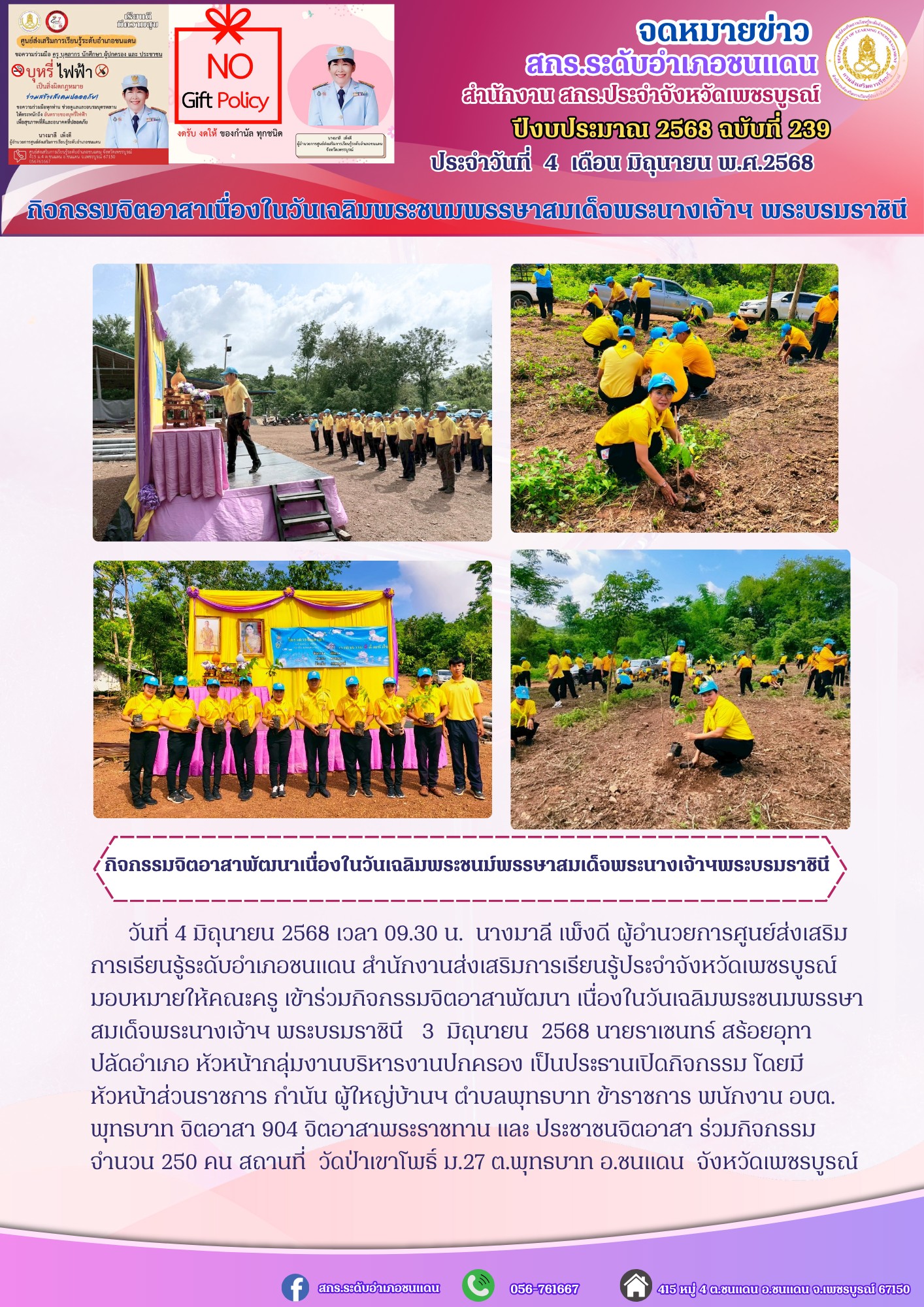 วันที่ 4 มิถุนายน 2568 เวลา 09.30 น. นางมาลี เพ็งดี ผู้อำนวยการศูนย์ส่งเสริมการเรียนรู้ระดับอำเภอชนแดน สำนักงานส่งเสริมการเรียนรู้ประจำจังหวัดเพชรบูรณ์ มอบหมายให้คณะครู เข้าร่วมกิจกรรมจิตอาสาพัฒนา เนื่องในวันเฉลิมพระชนมพรรษา สมเด็จพระนางเจ้าฯ พระบรมราชินี 3 มิถุนายน 2568 นายราเชนทร์ สร้อยอุทา ปลัดอำเภอ หัวหน้ากลุ่มงานบริหารงานปกครอง เป็นประธานเปิดกิจกรรม โดยมี หัวหน้าส่วนราชการ กำนัน ผู้ใหญ่บ้านฯ ตำบลพุทธบาท ข้าราชการ พนักงาน อบต.พุทธบาท จิตอาสา 904 จิตอาสาพระราชทาน และ ประชาชนจิตอาสา ร่วมกิจกรรม จำนวน 250 คน สถานที่ วัดป่าเขาโพธิ์ ม.27 ต.พุทธบาท อ.ชนแดน จังหวัดเพชรบูรณ์