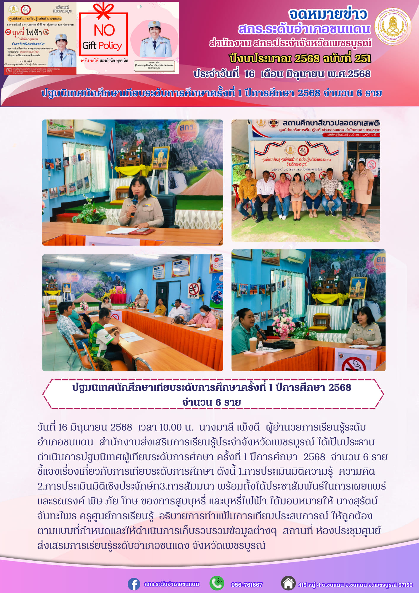 นางมาลี เพ็งดี ผู้อำนวยการเรียนรู้ระดับอำเภอชนแดน สำนักงานส่งเสริมการเรียนรู้ประจำจังหวัดเพชรบูรณ์ ได้เป็นประธานดำเนินการปฐมนิเทศผู้เทียบระดับการศึกษา ครั้งที่ 1 ปีการศึกษา 2568 จำนวน 6 ราย ชี้แจงเรื่องเกี่ยวกับการเทียบระดับการศึกษา ดังนี้