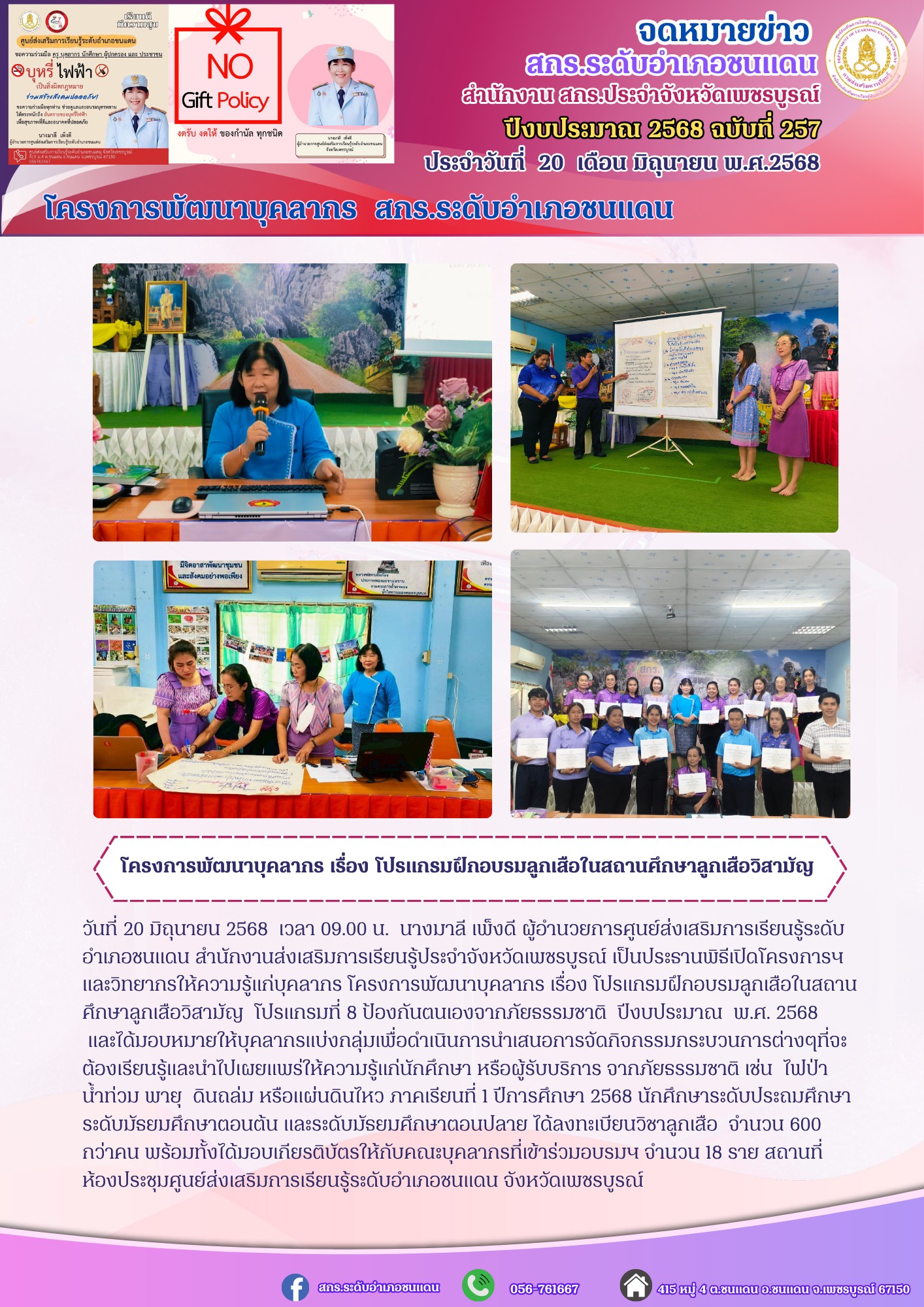 นางมาลี เพ็งดี ผู้อำนวยการศูนย์ส่งเสริมการเรียนรู้ระดับอำเภอชนแดน สำนักงานส่งเสริมการเรียนรู้ประจำจังหวัดเพชรบูรณ์ เป็นประธานพิธีเปิดโครงการฯและวิทยากรให้ความรู้แก่บุคลากร โครงการพัฒนาบุคลากร เรื่อง โปรแกรมฝึกอบรมลูกเสือในสถานศึกษาลูกเสือวิสามัญ โปรแกรมที่ 8 ป้องกันตนเองจากภัยธรรมชาติ ปีงบประมาณ พ.ศ. 2568