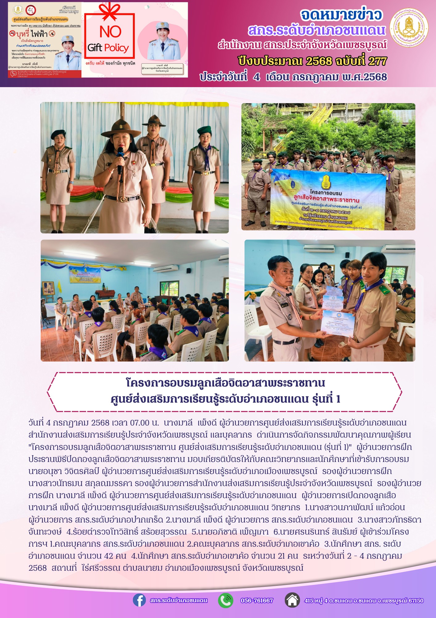 นางมาลี เพ็งดี ผู้อำนวยการศูนย์ส่งเสริมการเรียนรู้ระดับอำเภอชนแดน สำนักงานส่งเสริมการเรียนรู้ประจำจังหวัดเพชรบูรณ์ และบุคลากร ดำเนินการจัดกิจกรรมพัฒนาคุณภาพผู้เรียน "โครงการอบรมลูกเสือจิตอาสาพระราชทาน ศูนย์ส่งเสริมการเรียนรู้ระดับอำเภอชนแดน (รุ่นที่ 1)"