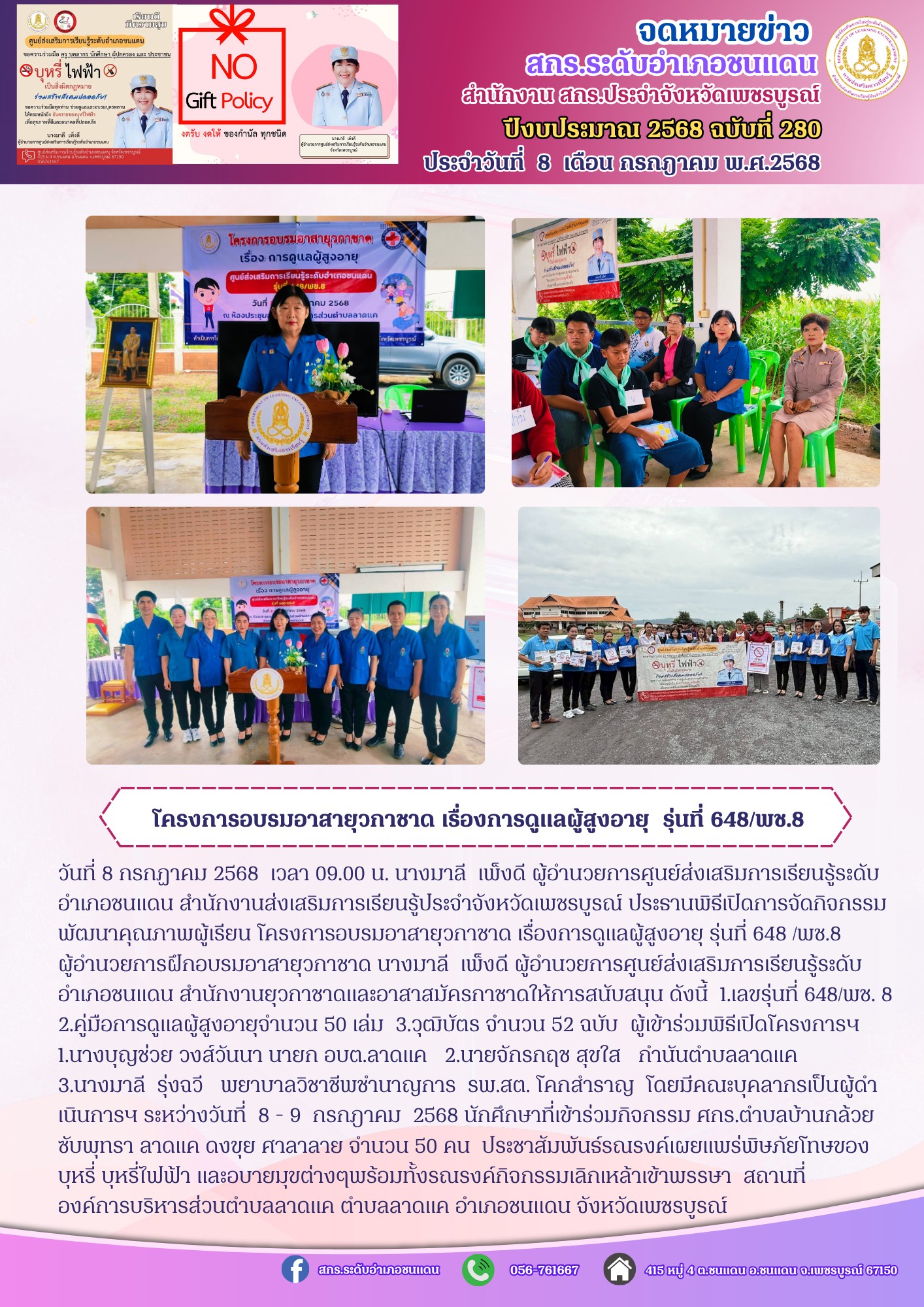 นางมาลี เพ็งดี ผู้อำนวยการศูนย์ส่งเสริมการเรียนรู้ระดับอำเภอชนแดน สำนักงานส่งเสริมการเรียนรู้ประจำจังหวัดเพชรบูรณ์ ประธานพิธีเปิดการจัดกิจกรรมพัฒนาคุณภาพผู้เรียน โครงการอบรมอาสายุวกาชาด เรื่องการดูแลผู้สูงอายุ รุ่นที่ 648 /พช.8 ผู้เข้าร่วมพิธีเปิดโครงการฯ 1.นางบุญช่วย วงส์วันนา นายก อบต.ลาดแค 2.นายจักรกฤช สุขใส กำนันตำบลลาดแค 3.นางมาลี รุ่งฉวี พยาบาลวิชาชีพชำนาญการ รพ.สต. โคกสำราญ โดยมีคณะบุคลากรเป็นผู้ดำเนินการฯ ระหว่างวันที่ 8 - 9 กรกฎาคม 2568 นักศึกษาที่เข้าร่วมกิจกรรม ศกร.ตำบลบ้านกล้วย ซับพุทรา ลาดแค ดงขุย ศาลาลาย จำนวน 50 คน สถานที่ องค์การบริหารส่วนตำบลลาดแค ตำบลลาดแค อำเภอชนแดน จังหวัดเพชรบูรณ์