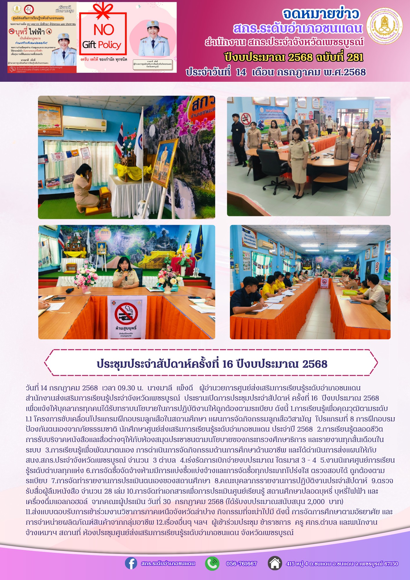 นางมาลี เพ็งดี ผู้อำนวยการศูนย์ส่งเสริมการเรียนรู้ระดับอำเภอชนแดน สำนักงานส่งเสริมการเรียนรู้ประจำจังหวัดเพชรบูรณ์ ประธานเปิดการประชุมประจำสัปดาห์ ครั้งที่ 16 ปีงบประมาณ 2568 เพื่อแจ้งให้บุคลากรทุกคนได้รับทราบนโยบายในการปฏิบัติงานให้ถูกต้องตามระเบียบ ดังนี้ 1.การเรียนรู้เพื่อคุณวุฒิตามระดับ