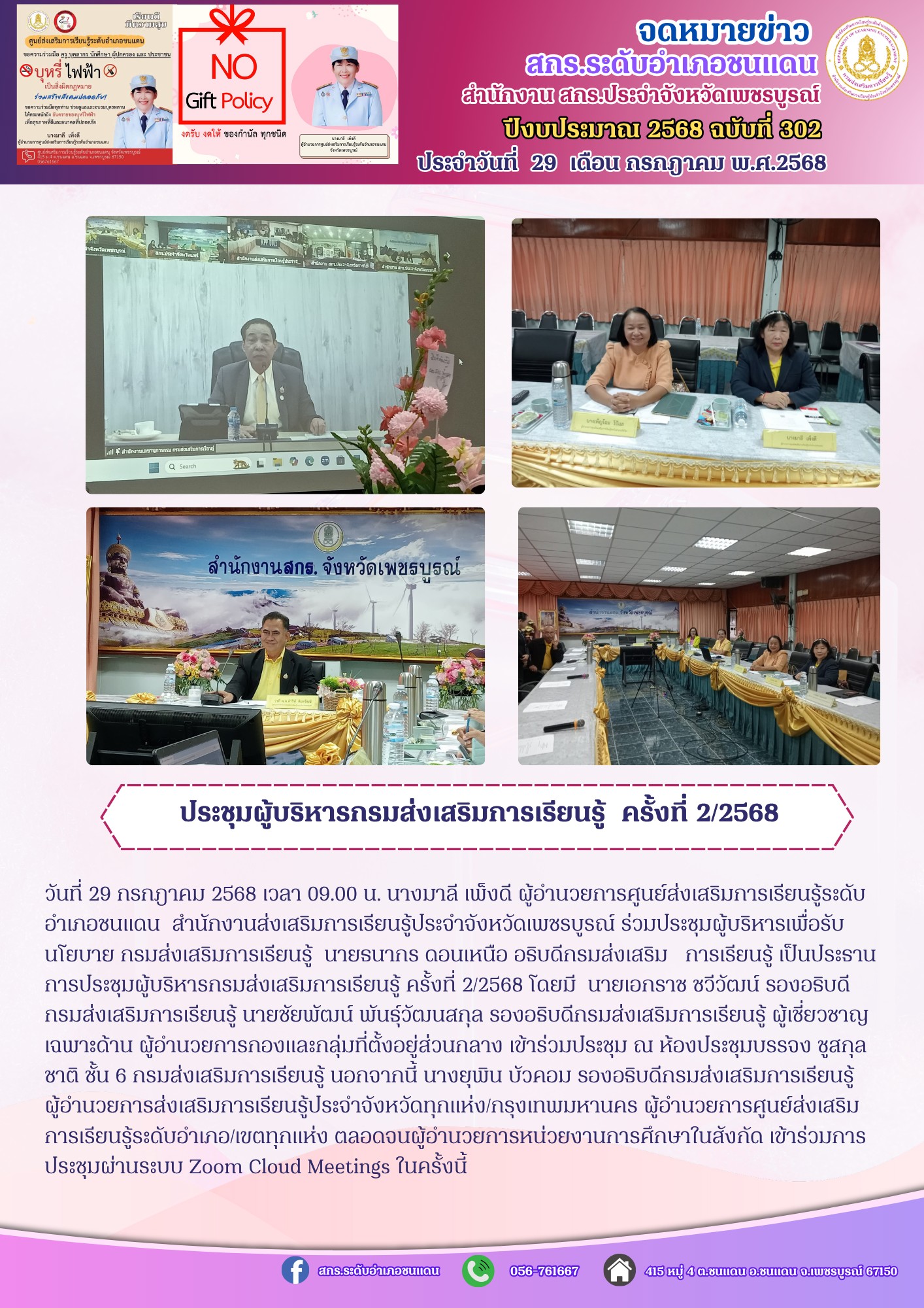 นายธนากร ดอนเหนือ อธิบดีกรมส่งเสริมการเรียนรู้ เป็นประธานการประชุมผู้บริหารกรมส่งเสริมการเรียนรู้ ครั้งที่ 2/2568 โดยมี นายเอกราช ชวีวัฒน์ รองอธิบดีกรมส่งเสริมการเรียนรู้ นายชัยพัฒน์ พันธุ์วัฒนสกุล รองอธิบดีกรมส่งเสริมการเรียนรู้ ผู้เชี่ยวชาญเฉพาะด้าน ผู้อำนวยการกองและกลุ่มที่ตั้งอยู่ส่วนกลาง เข้าร่วมประชุม ณ ห้องประชุมบรรจง ชูสกุลชาติ ชั้น 6 กรมส่งเสริมการเรียนรู้ นอกจากนี้ นางยุพิน บัวคอม รองอธิบดีกรมส่งเสริมการเรียนรู้ ผู้อำนวยการส่งเสริมการเรียนรู้ประจำจังหวัดทุกแห่ง/กรุงเทพมหานคร ผู้อำนวยการศูนย์ส่งเสริมการเรียนรู้ระดับอำเภอ/เขตทุกแห่ง ตลอดจนผู้อำนวยการหน่วยงานการศึกษาในสังกัด เข้าร่วมการประชุมผ่านระบบ Zoom Cloud Meetings ในครั้งนี้