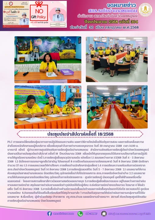 นางมาลี เพ็งดี ผู้อำนวยการศูนย์ส่งเสริมการเรียนรู้ระดับอำเภอชนแดน สำนักงานส่งเสริมการเรียนรู้ประจำจังหวัดเพชรบูรณ์ ประธานเปิดการประชุมประจำสัปดาห์ ครั้งที่ 18 ปีงบประมาณ 2568 เพื่อแจ้งให้บุคลากรทุกคนได้รับทราบนโยบายในการปฏิบัติงานให้ถูกต้องตามระเบียบ ดังนี้ 1.การเรียนรู้เพื่อคุณวุฒิตามระดับ แจ้งเรื่อง