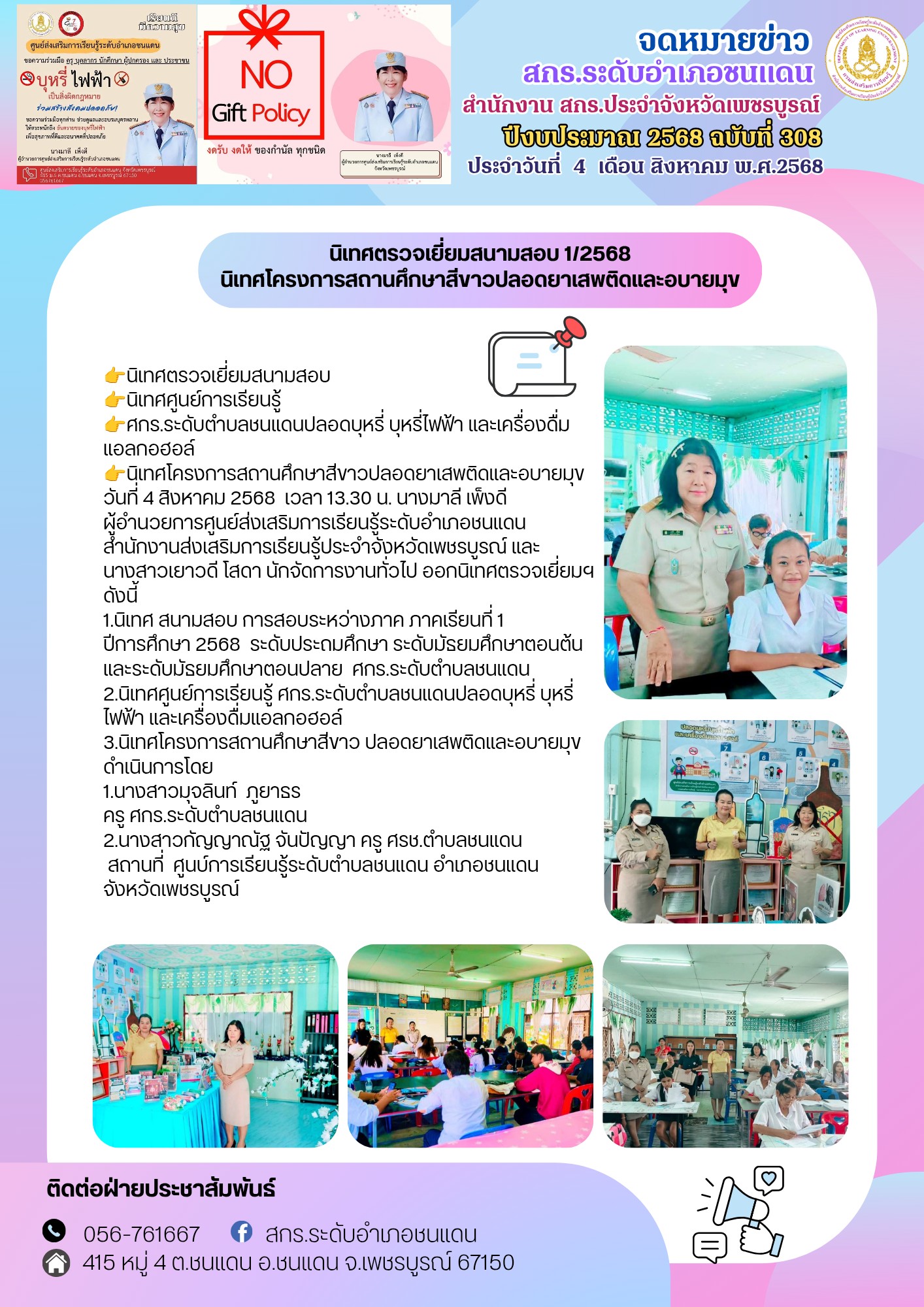 1.นิเทศ สนามสอบ การสอบระหว่างภาค ภาคเรียนที่ 1 ปีการศึกษา 2568 ระดับประถมศึกษา ระดับมัธยมศึกษาตอนต้น และระดับมัธยมศึกษาตอนปลาย ศกร.ระดับตำบลชนแดน