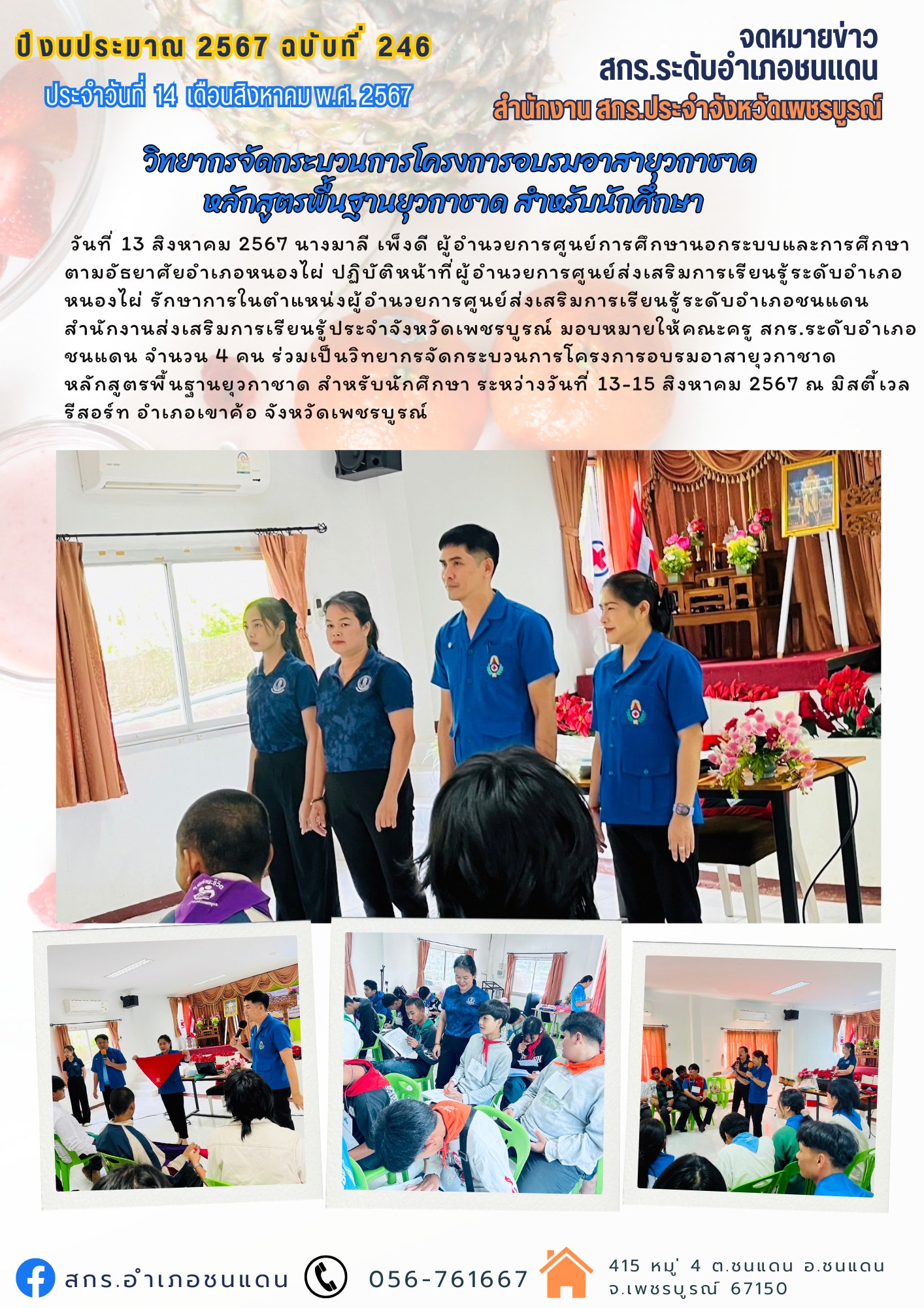 นางมาลี เพ็งดี ผู้อำนวยการศูนย์การศึกษานอกระบบและการศึกษาตามอัธยาศัยอำเภอหนองไผ่ ปฏิบัติหน้าที่ผู้อำนวยการศูนย์ส่งเสริมการเรียนรู้ระดับอำเภอหนองไผ่ รักษาการในตำแหน่งผู้อำนวยการศูนย์ส่งเสริมการเรียนรู้ระดับอำเภอชนแดน สำนักงานส่งเสริมการเรียนรู้ประจำจังหวัดเพชรบูรณ์ มอบหมายให้คณะครู สกร.ระดับอำเภอชนแดน ร่วมเป็นวิทยากรจัดกระบวนการโครงการอบรมอาสายุวกาชาด หลักสูตรพื้นฐานยุวกาชาด สำหรับนักศึกษา ระหว่างวันที่ 13-15 สิงหาคม 2567 ณ มิสตี้เวลรีสอร์ท อำเภอเขาค้อ จังหวัดเพชรบูรณ์