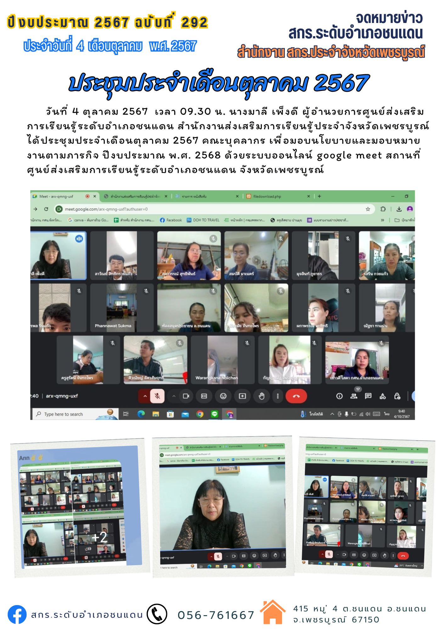 วันที่ 4 ตุลาคม 2567 เวลา 09.30 น. นางมาลี เพ็งดี ผู้อำนวยการศูนย์ส่งเสริมการเรียนรู้ระดับอำเภอชนแดน สำนักงานส่งเสริมการเรียนรู้ประจำจังหวัดเพชรบูรณ์ ได้ประชุมประจำเดือนตุลาคม 2567 คณะบุคลากร เพื่อมอบนโยบายและมอบหมายงานตามภารกิจ ปีงบประมาณ พ.ศ. 2568 ด้วยระบบออนไลน์ google meet สถานที่ ศูนย์ส่งเสริมการเรียนรู้ระดับอำเภอชนแดน จังหวัดเพชรบูรณ์