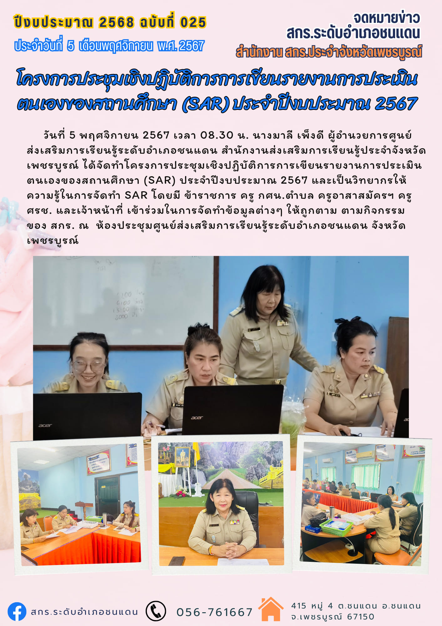 วันที่ 5 พฤศจิกายน 2567 เวลา 08.30 น.นางมาลี เพ็งดี ผู้อำนวยการศูนย์ส่งเสริมการเรียนรู้ระดับอำเภอชนแดน สำนักงานส่งเสริมการเรียนรู้ประจำจังหวัดเพชรบูรณ์ ได้จัดทำโครงการประชุมเชิงปฏิบัติการการเขียนรายงานการประเมินตนเองของสถานศึกษา (SAR)  ประจำปีงบประมาณ 2567 และเป็นวิทยากรให้ความรู้ในการจัดทำ SAR  โดยมี ข้าราชการ ครู กศน.ตำบล ครูอาสาสมัครฯ ครู ศรช. และเจ้าหน้าที่ เข้าร่วมในการจัดทำข้อมูลต่างๆ ให้ถูกตาม ตามกิจกรรม ของ สกร.  ณ ห้องประชุมศูนย์ส่งเสริมการเรียนรู้ระดับอำเภอชนแดน จังหวัดเพชรบูรณ์