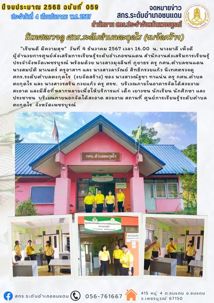 "เรียนดี มีความสุข" วันที่ 4 ธันวาคม 2567 เวลา 16.00 น. นางมาลี เพ็งดี ผู้อำนวยการศูนย์ส่งเสริมการเรียนรู้ระดับอำเภอชนแดน สำนักงานส่งเสริมการเรียนรู้ประจำจังหวัดเพชรบูรณ์ พร้อมด้วย นางสาวมุจลินท์ ภูยาธร ครู กศน.ตำบลชนแดน นางสมบัติ มาเนตร์ ครูอาสาฯ และ นางสาวลาวัณย์ สิทธิกรวยแก้ว นิเทศตรวจเยี่ยม ศกร.ระดับตำบลตะกุดไร (งบจัดสร้าง) ของ นางสาวณัฐชา ทาแน่น ครู กศน.ตำบลตะกุดไร และ นางสาวรสริน กวยแก้ว ครู ศรช. บริเวณภายในอาคารจัดได้สวยงาม สะอาด และมีสื่อที่หลากหลายเพื่อให้บริการแก่ เด็ก เยาวชน นักเรียน นักศึกษา และประชาชน บริเวณภายนอกจัดได้สะอาด สวยงาม สถานที่ ศูนย์การเรียนรู้ระดับตำบลตะกุดไร จังหวัดเพชรบูรณ์