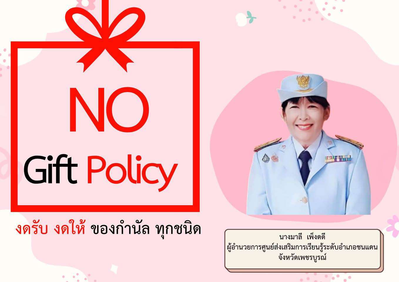 วันที่ 27 ธันวาคม 2567 นางมาลี เพ็งดี ผู้อำนวยการศูนย์ส่งเสริมการเรียนรู้ระดับอำเภอชนแดน สำนักงานส่งเสริมการเรียนรู้ประจำจังหวัดเพชรบูรณ์ และคณะบุคลากรได้ประกาศเจตนารมณ์ "สุจริต โปร่งใส จังหวัดเพชรบูรณ์ใสสะอาด 2568" และ "งดรับ งดให้" ของขวัญ ของกำนัล ทุกชนิดจากการปฏิบัติหน้าที่ (No Gift Policy) เพื่อเป็นการปลูกฝังค่านิยมในการปฏิบัติงานด้วยความซื่อสัตย์สุจริตเป็นไปตามหลักธรรมาภิบาล ลดโอกาสการรับสินบนของเจ้าหน้าที่ของรัฐ และเป็นมาตรการภายในเพื่อป้องกันการทุจริตให้กับทุกภาคส่วนในจังหวัดเพชรบูรณ์