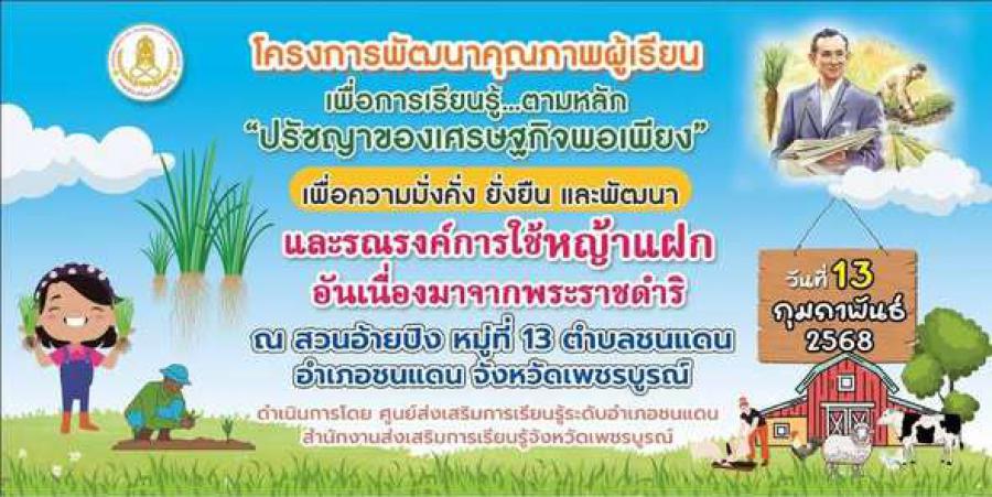 ศูนย์ส่งเสริมการเรียนรู้ระดับอำเภอชนแดน สำนักงานส่งเสริมการเรียนรู้ประจำจังหวัดเพชรบูรณ์ จะดำเนินการจัดกิจกรรมโครงการพัฒนาคุณภาพผู้เรียน เพื่อการเรียนรู้ "ตามหลักปรัชญาของเศรษฐกิจพอเพียง" เพื่อความมั่งคั่ง ยั่งยืน และพัฒนา และรณรงค์การใช้หญ้าแฝกอันเนื่องมาจากพระราชดำริ สถานที่ สวนอ้ายปิง หมู่ที่ 13 ตำบลชนแดน อำเภอชนแดน จังหวัดเพชรบูรณ์
