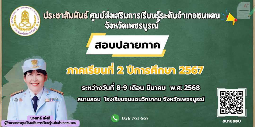 แจ้งประชาสัมพันธ์ ศูนย์ส่งเสริมการเรียนรู้ระดับอำเภอชนแดน สำนักงานส่งเสริมการเรียนรู้ประจำจังหวัดเพชรบูรณ์ จะดำเนินการสอบนักศึกษาที่ลงทะเบียน ภาคเรียนที่ 2 ปีการศึกษา 2567 ระหว่างวันที่ 8 - 9 มีนาคม 2568 สนามสอบ โรงเรียนชนแดนวิทยาคม จังหวัดเพชรบูรณ์ ขอให้นักศึกษาทุกท่าน ตรวจสอบรายชื่อผู้มีสิทธิ์สอบได้ที่ ครู กศน.ตำบล หรือสอบถามได้ที่ ศูนย์ส่งเสริมการเรียนรู้ระดับอำเภอชนแดน (กศน.)