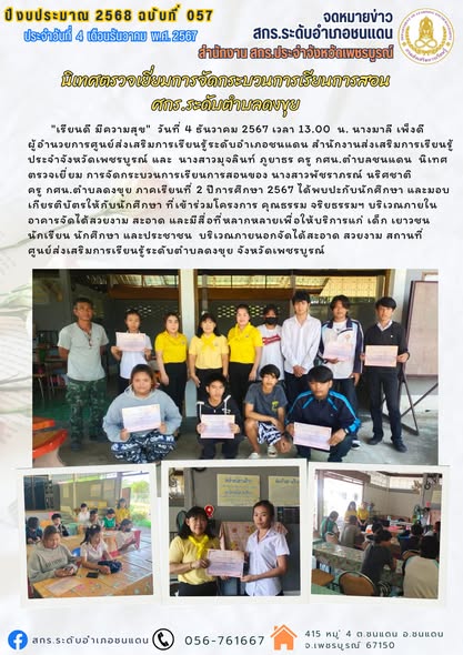 "เรียนดี มีความสุข" วันที่ 4 ธันวาคม 2567 เวลา 13.00 น. นางมาลี เพ็งดี ผู้อำนวยการศูนย์ส่งเสริมการเรียนรู้ระดับอำเภอชนแดน สำนักงานส่งเสริมการเรียนรู้ประจำจังหวัดเพชรบูรณ์ และ นางสาวมุจลินท์ ภูยาธร ครู กศน.ตำบลชนแดน นิเทศตรวจเยี่ยม การจัดกระบวนการเรียนการสอนของ นางสาวพัชราภรณ์ นริศชาติ ครู กศน.ตำบลดงขุย ภาคเรียนที่ 2 ปีการศึกษา 2567 ได้พบปะกับนักศึกษา และมอบเกียรติบัตรให้กับนักศึกษา ที่เข้าร่วมโครงการ คุณธรรม จริยธรรมฯ บริเวณภายในอาคารจัดได้สวยงาม สะอาด และมีสื่อที่หลากหลายเพื่อให้บริการแก่ เด็ก เยาวชน นักเรียน นักศึกษา และประชาชน บริเวณภายนอกจัดได้สะอาด สวยงาม สถานที่ ศูนย์ส่งเสริมการเรียนรู้ระดับตำบลดงขุย จังหวัดเพชรบูรณ์